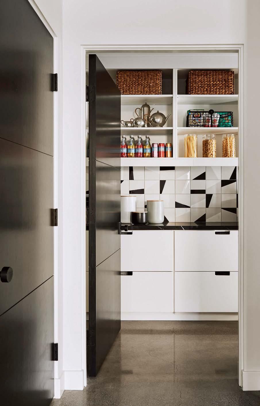 Right: The pantry injects a touch of graphic, European influence to the mix. The glazed-porcelain tiles on its backsplash are Wow through Saxum Tile Design Studio. Opposite: Earthy elements in the kitchen, such as a slatted-wood hood cover by DLC Builders Inc., balance the abundance of marble. Verpan counter stools from the Danish Design Store in a Kvadrat fabric sit below a brass-and-whiteleather pendant by Katy Skelton.