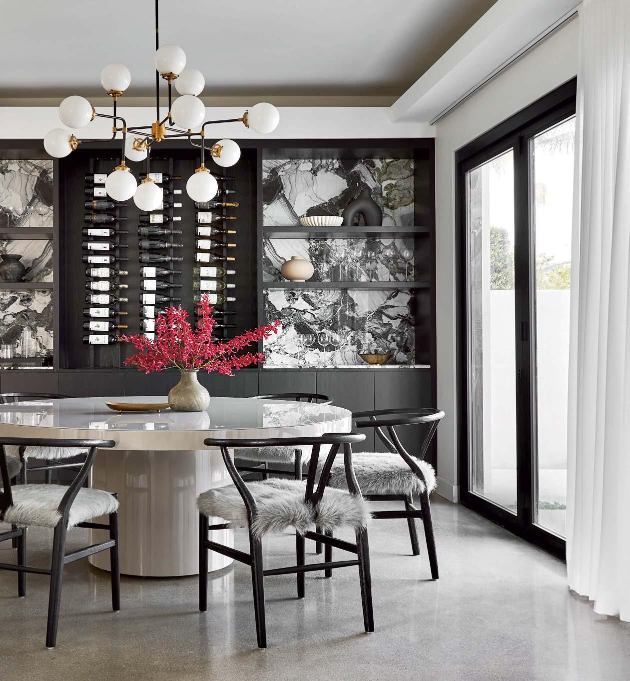 In the dining room, black wishbone chairs from HD Buttercup encircle a gray-lacquered pedestal table from Modloft above which hangs an Arteriors chandelier. The custom wine cabinet features a marble backsplash and ebonized-oak cabinets.