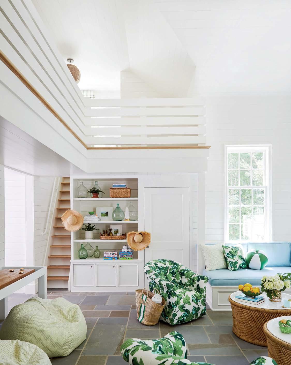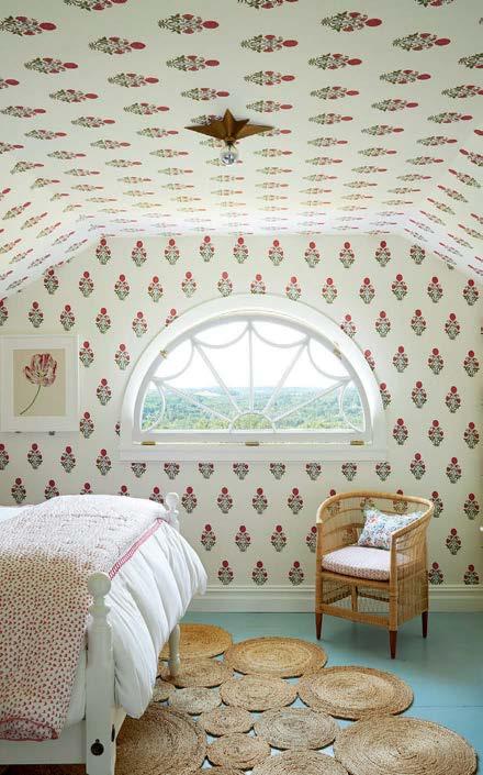 Opposite: The petite motif of Cole & Son’s Hummingbirds Icons wallpaper wraps the adjoining daughters’ bedroom, where McAlpine’s built-in bunks boast decorative corbels. Booth’s furnishings sweetly follow suit with a pair of John Derian’s Baronet chairs for Cisco Home set around Nickey Kehoe’s Round Hassock ottoman beneath a lantern by Coleen & Company. Below lies RH’s Malta rug.