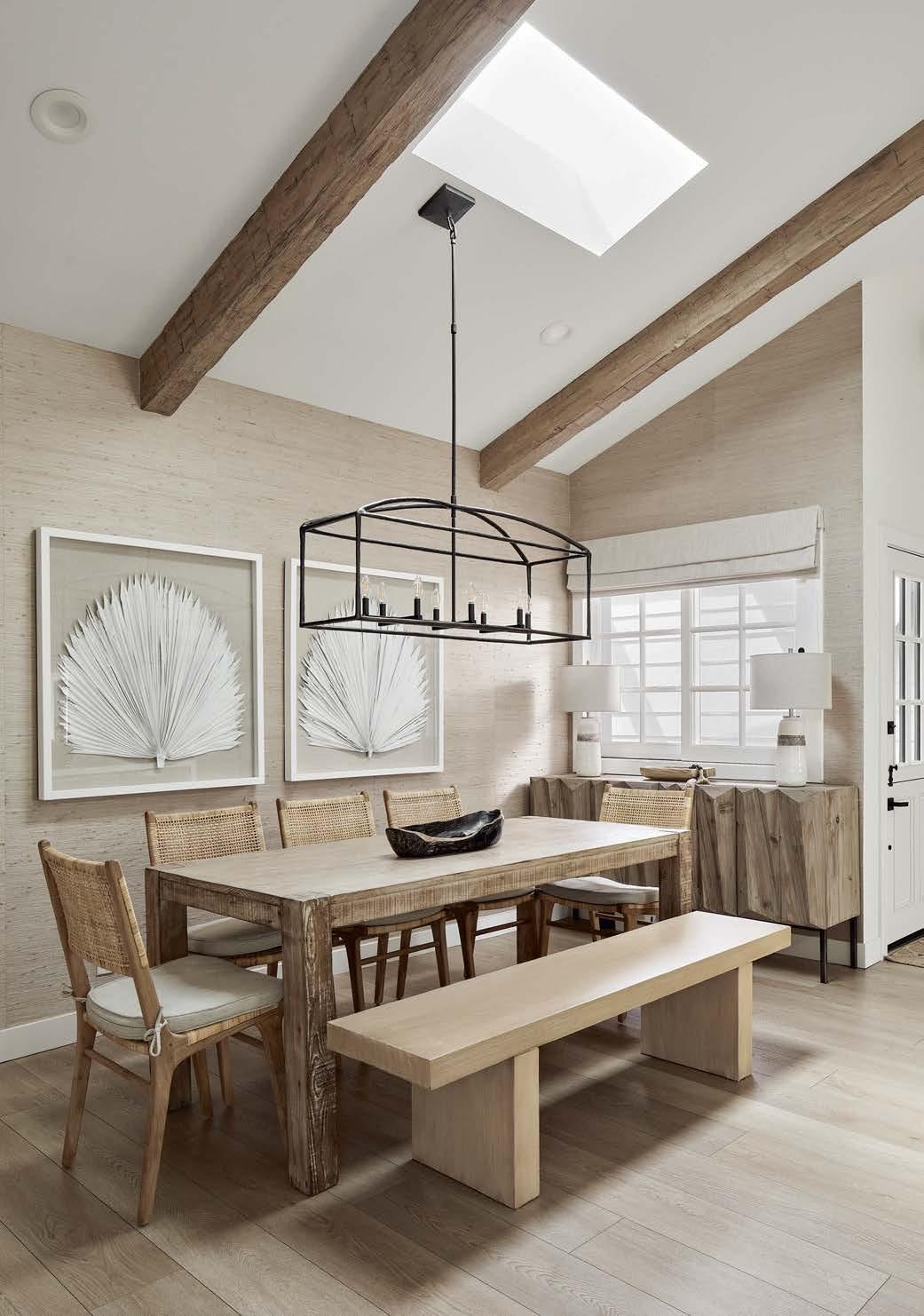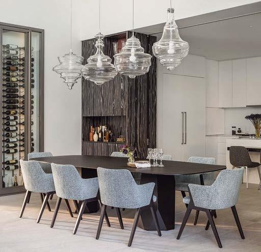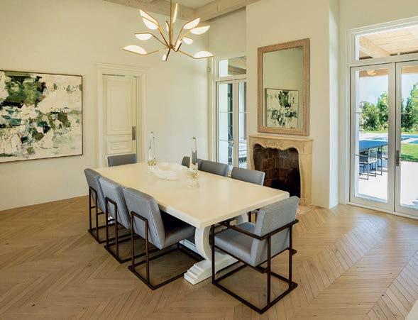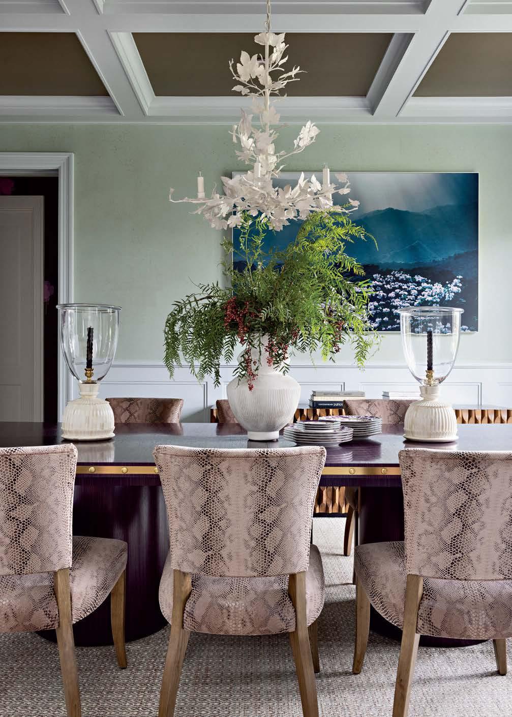 Opposite: Designers Deborah Costa and Kristine Renee matched the owners’ Oly Studio table with Organic Modernism chairs wearing Peter Dunham textiles in the dining room. The bespoke chandelier joins a Beetle sconce from Gallery L7 and an Arteriors table lamp sporting a Vaughan shade.