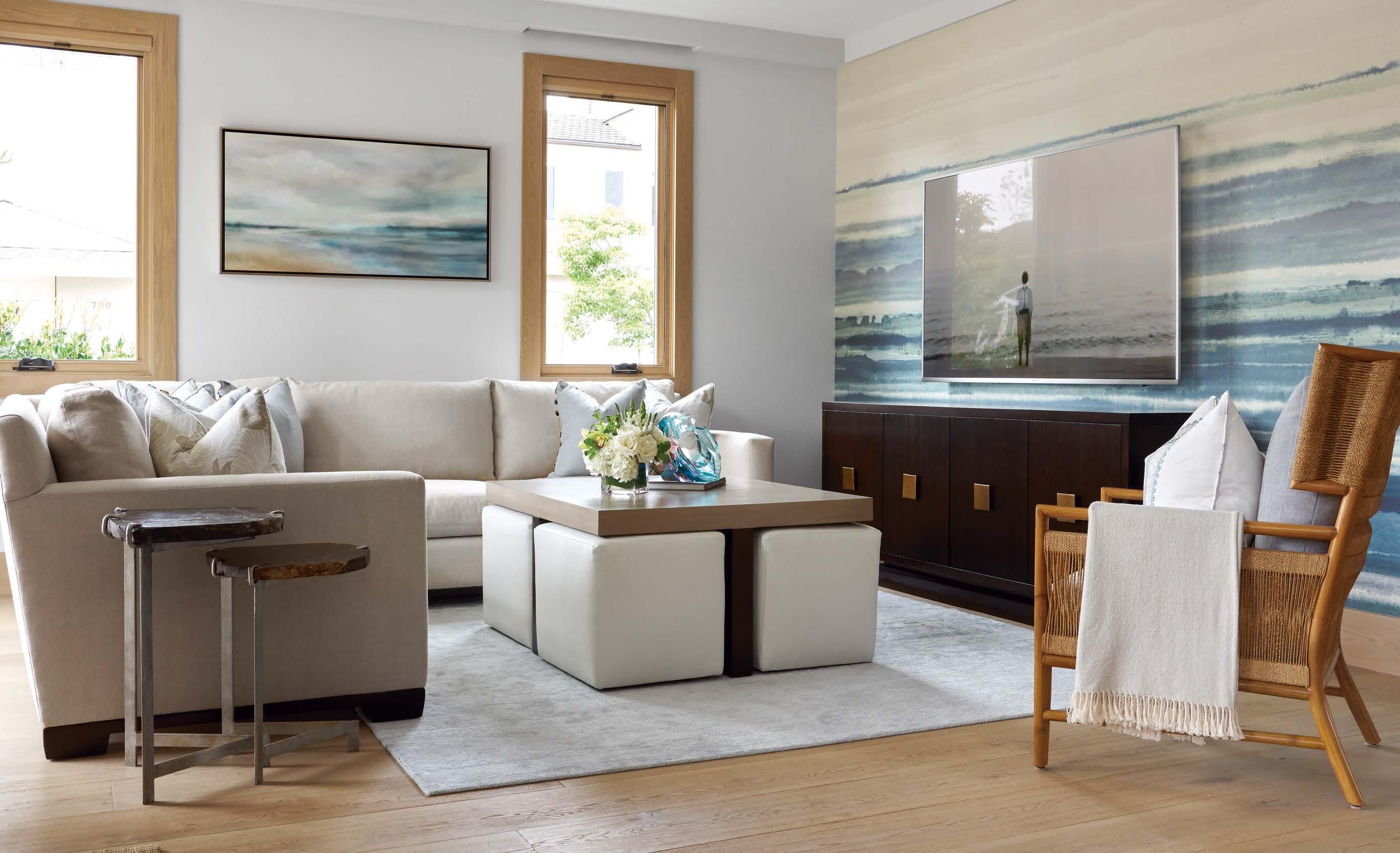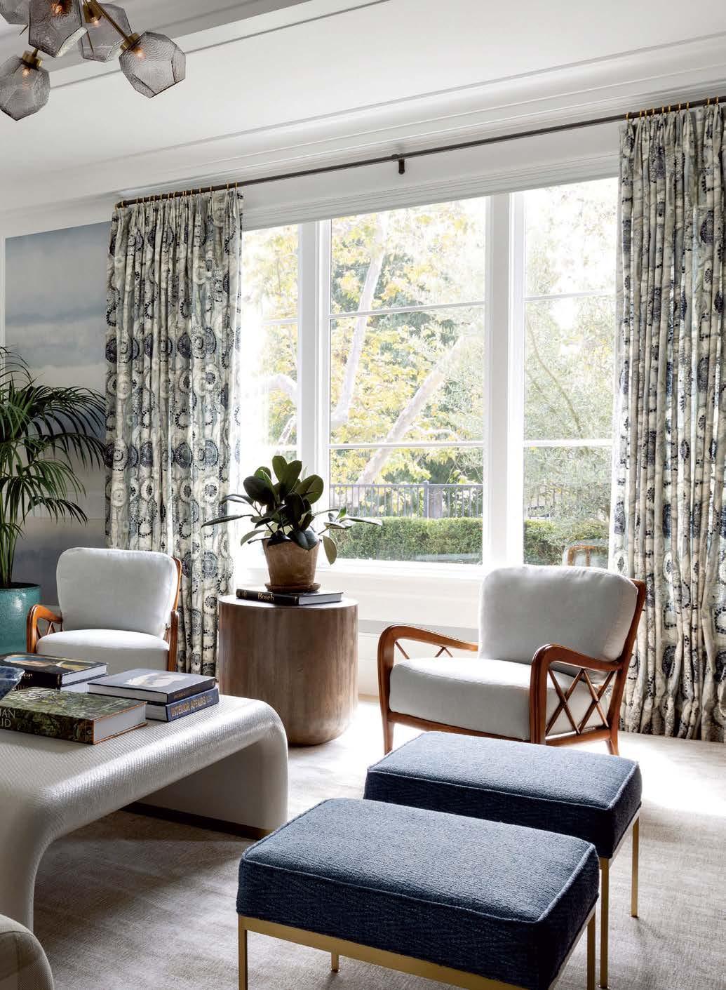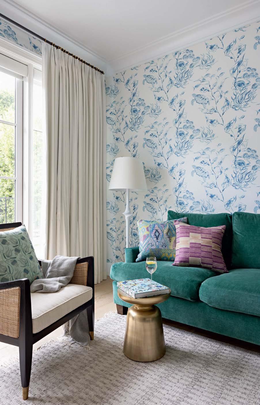 Schumacher’s watercolor-like Orissa wallcovering establishes the living room’s coastal vibe. Jasper’s Jordan sofa, Paolo Buffa walnut armchairs and Paul ottomans by Lawson-Fenning provide plenty of places to perch around a Made Goods coffee table.