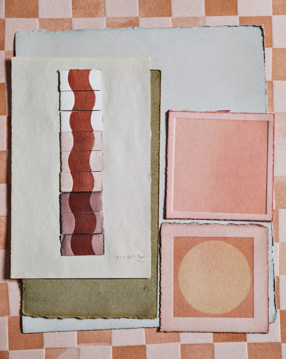 In her downtown L.A. studio, Cheryl Humphreys (bottom) performs a pressure test on her paper press. Drawers in her work space are filled with studies and sketches, such as samples colored with indigo dye and ink (below) or drawings for a series called “Recentering” (left). Various framed finished works (opposite) demonstrate how the artist plays with color, shadow and movement.
