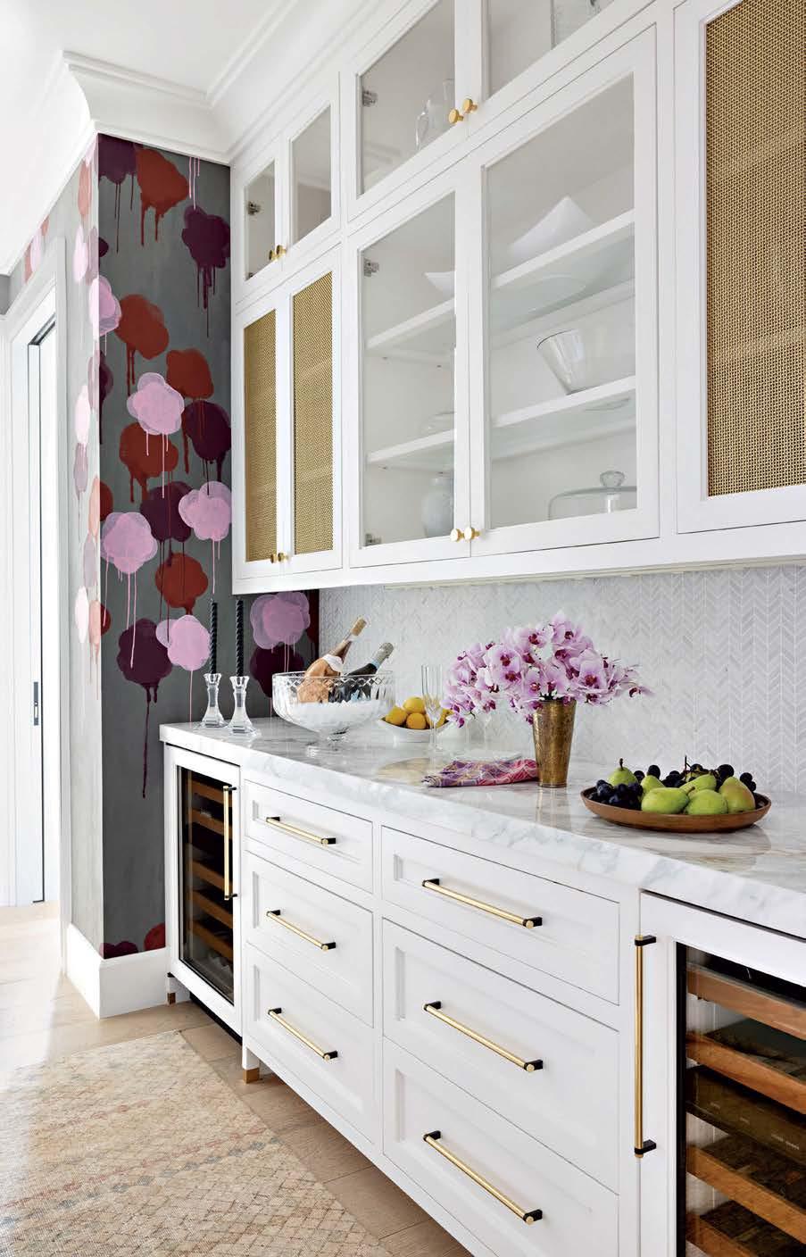 Right: Designer Parrish Cameron Robe pulled the butler pantry’s playful hand-painted Floral Graffiti wallpaper by Porter Teleo directly from her color-loving clients’ inspiration boards. The rug is from Jamal’s Rug Collection.