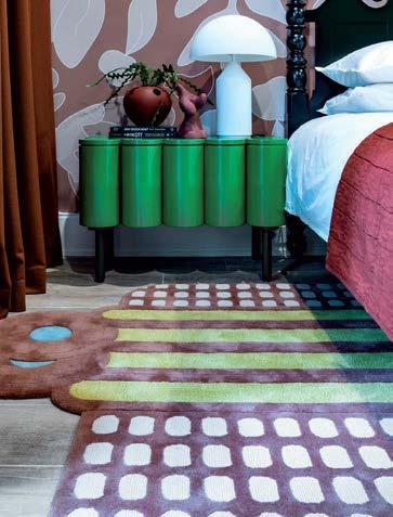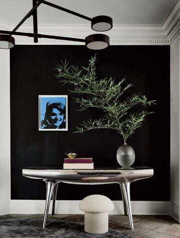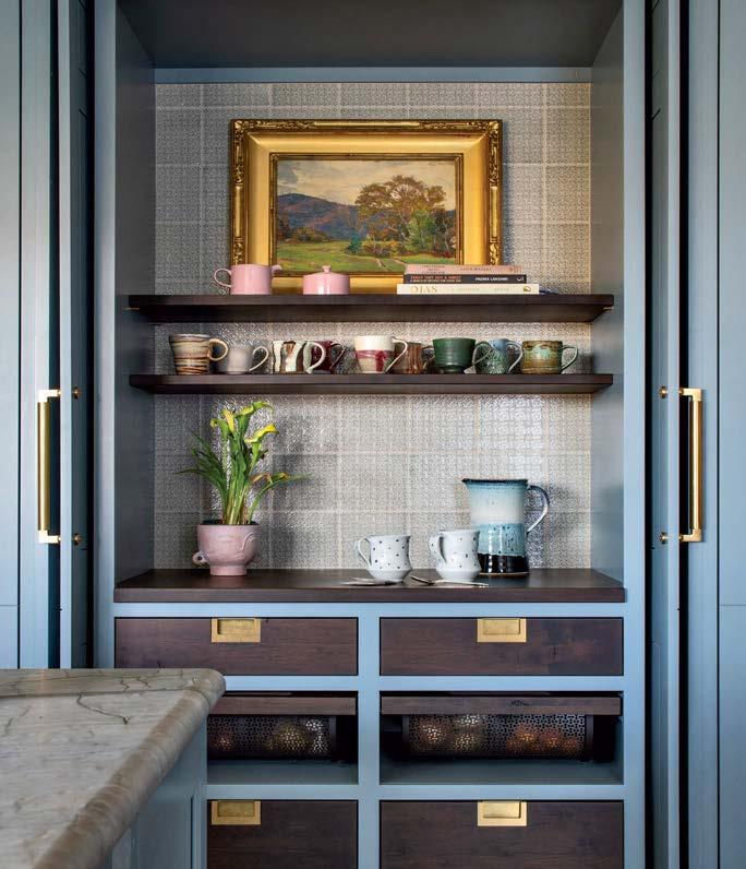 While it proudly displays its Mediterranean credentials, the home is anything but a period recreation. Wallpapers in a profusion of prints— like the mermaids and seahorses frolicking in the daughter’s bathroom, the clay-pot motif adorning the pantry and the floral in the library—keep things fresh. There’s a level of practicality too: The living room features sofas in an indooroutdoor performance fabric and a rug made of jute squares that are stitched together and can each be easily replaced should wear occur.