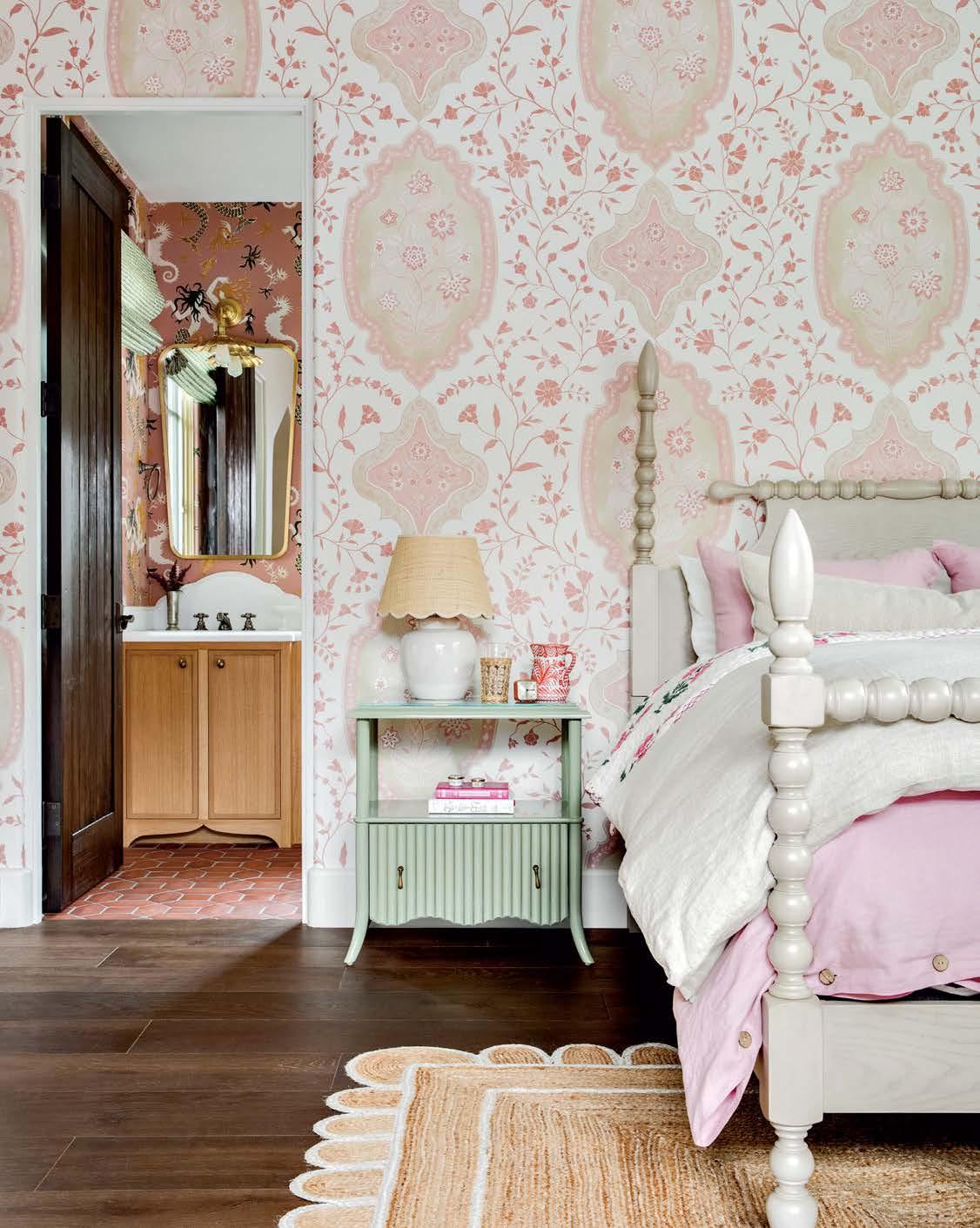 Opposite: Wallpaper by Seema Krish is the backdrop for the daughter’s Birch Lane bed and bedside table by Trove. The jute rug is by Dhurrie World and a Pierre Frey print in the bathroom lends a fanciful note.