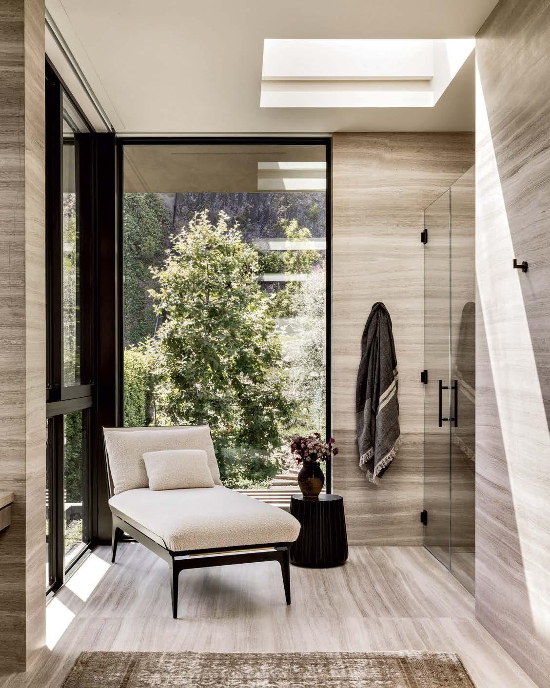 Opposite: Clad in White Wood marble from Stoneland USA, the primary bath is a sanctuary inspired by high-end spa resorts. Gabriel Scott’s Boudoir Chaise Longue joins a vintage rug from Woven for chic touches of softness.