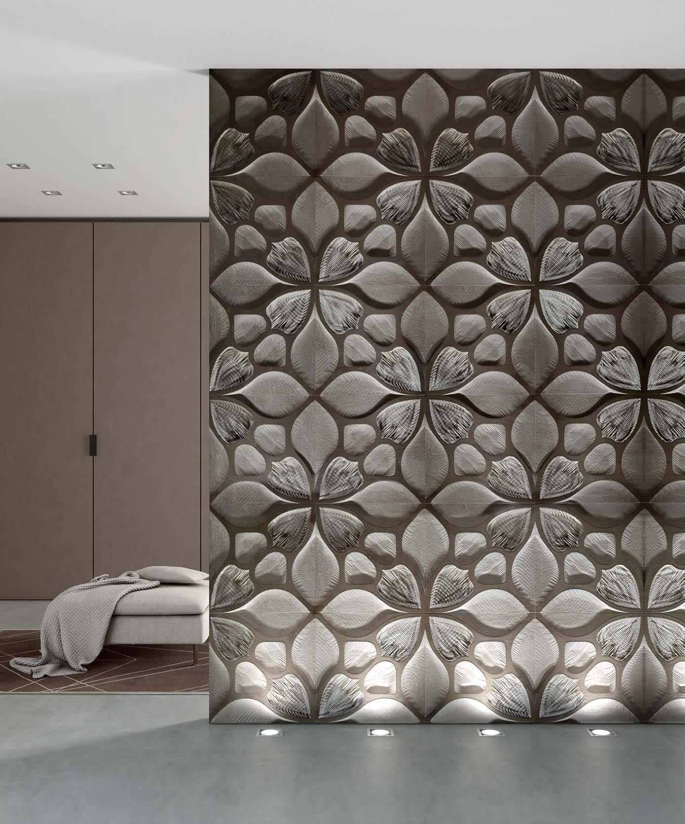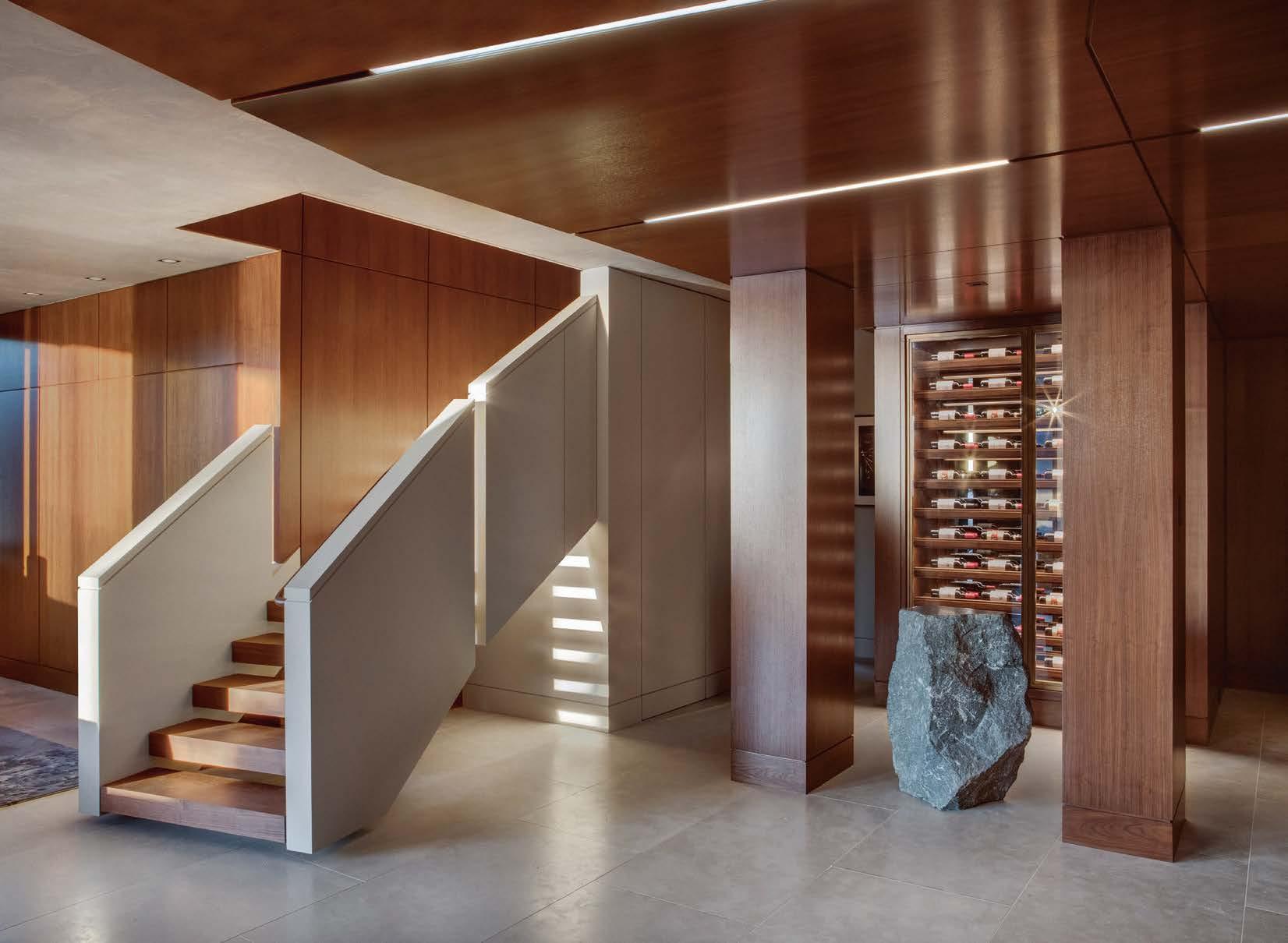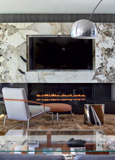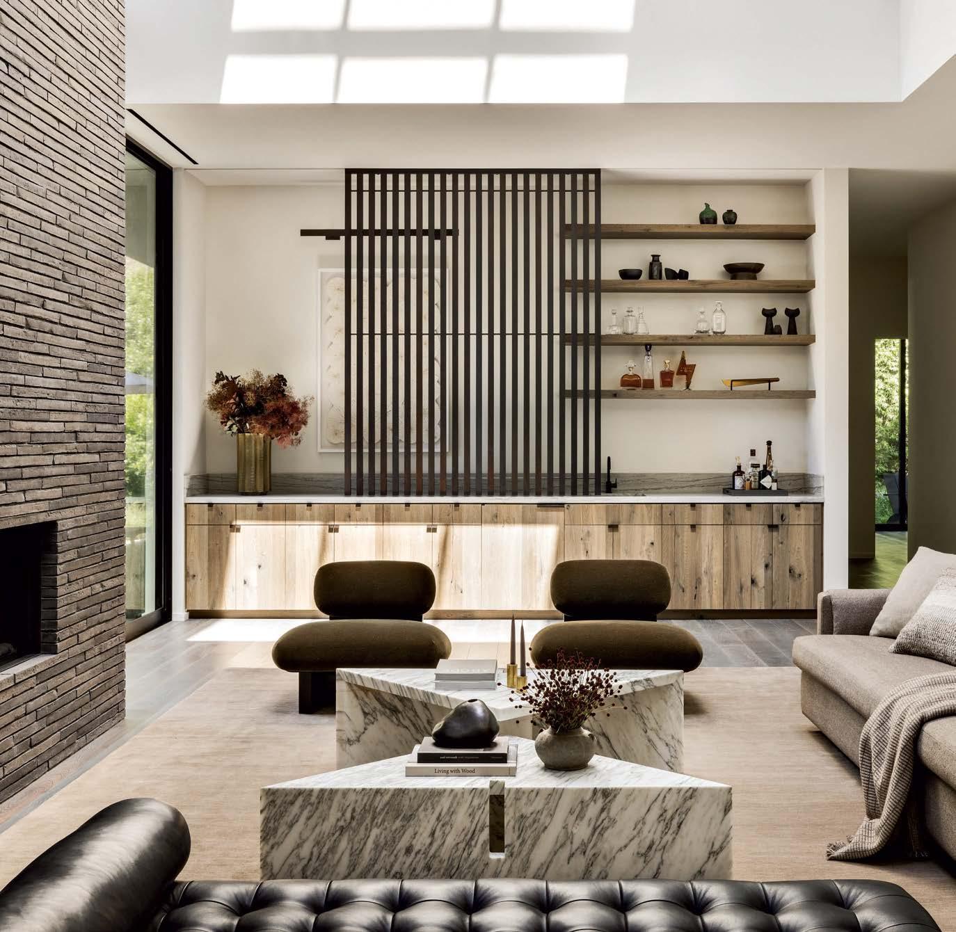 and barware when the couple is entertaining. “We collaborated with Marmol Radziner to determine the best aesthetic and functionality for this feature, gravitating toward a darker finish to complement the coordinating fireplace stone,” Wollack explains.