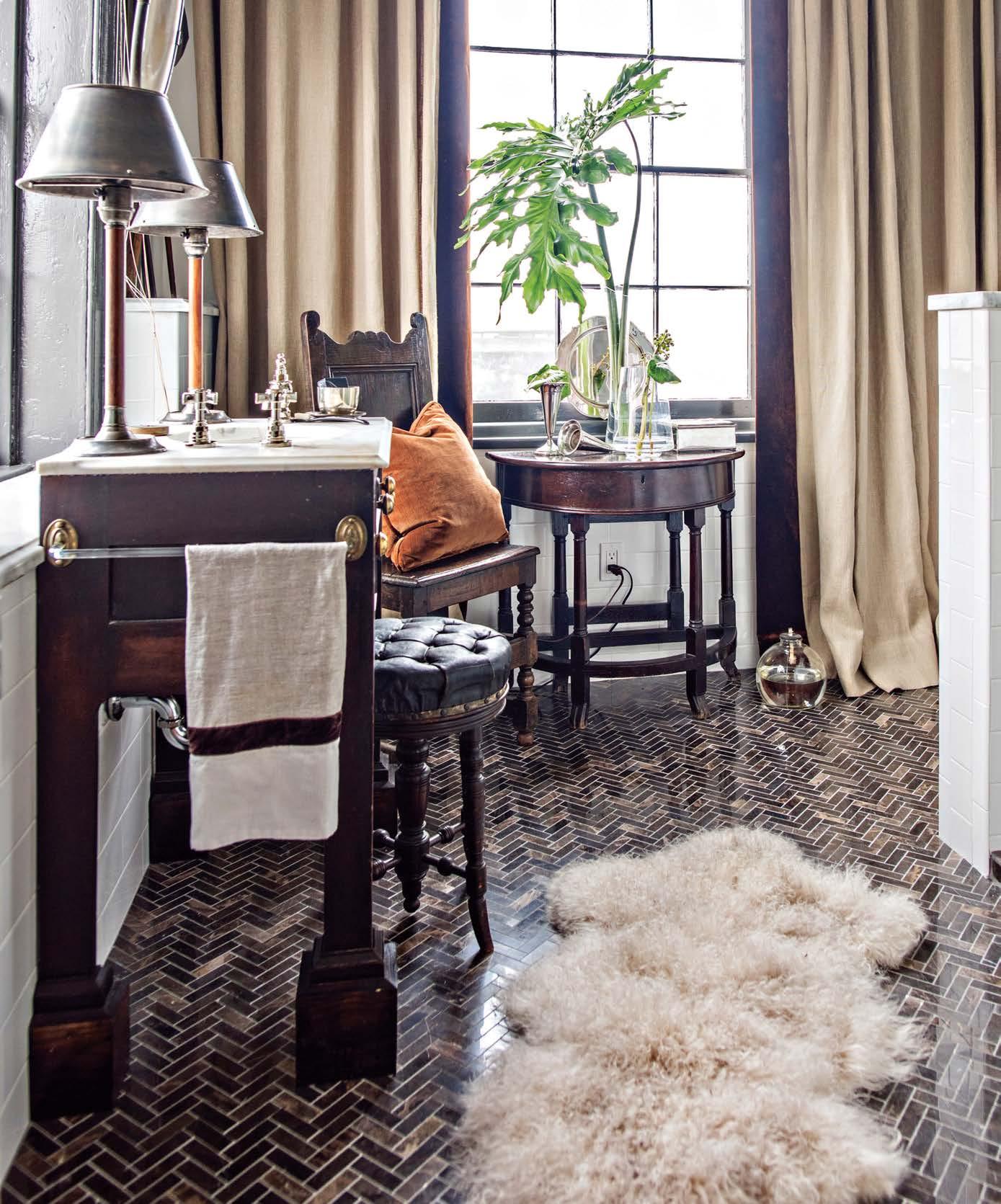 As for the bathrooms, they were transformed with deep-toned stones and surfaces, such as limewash in the subtly dramatic downstairs powder room. And, in the completely remodeled primary bath, the new concept is meant to evoke the tranquility of a luxurious spa, with a vintage rug and chaise lounge bringing in the warmth the owners desired.