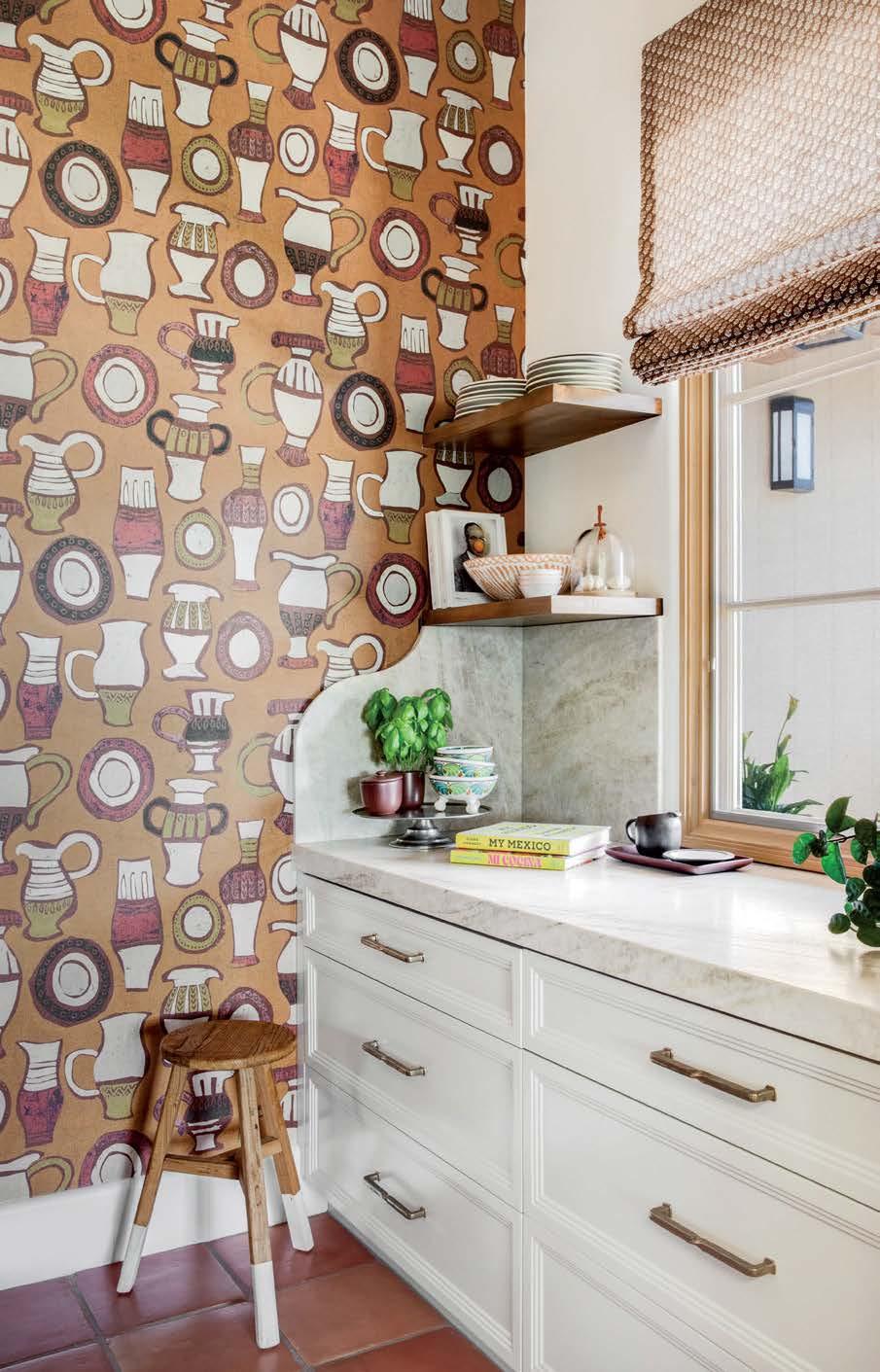 Right: In another Mediterranean nod, Pierre Frey’s 1950s-inspired Les Poteries wallcovering brings a dash of fun and personality to the pantry. The pulls are from Rocky Mountain Hardware and the stool is by Four Hands.