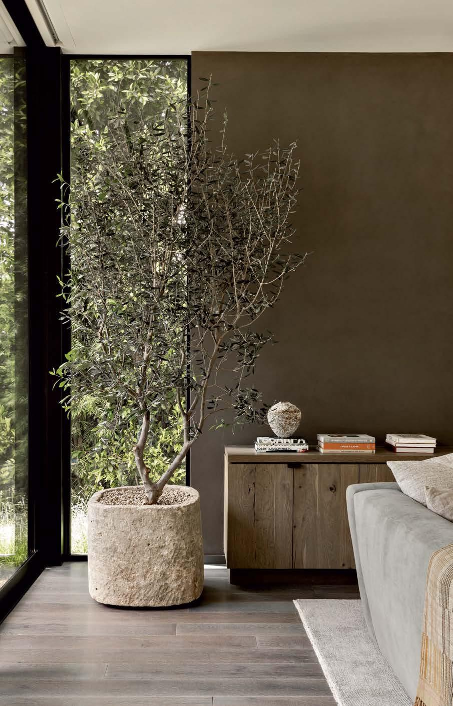Right: A vintage stone vessel from Inner Gardens displays an olive tree in one corner of the family room, connecting the interiors to the outside greenery. The console beside it is a Marmol Radziner bespoke design.