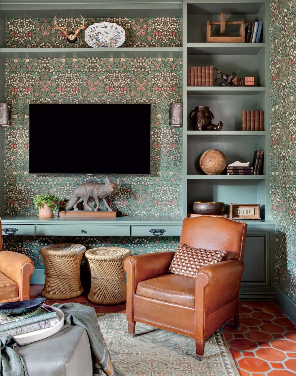 Above: What was once the office became a library lined with William Morris wallpaper and woodwork painted Farrow & Ball’s Green Smoke. The chairs are family heirlooms and the Oushak carpet and stools are vintage. The sconces are Custom Cut Lighting.