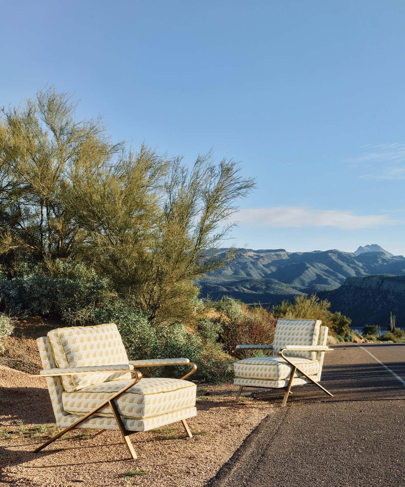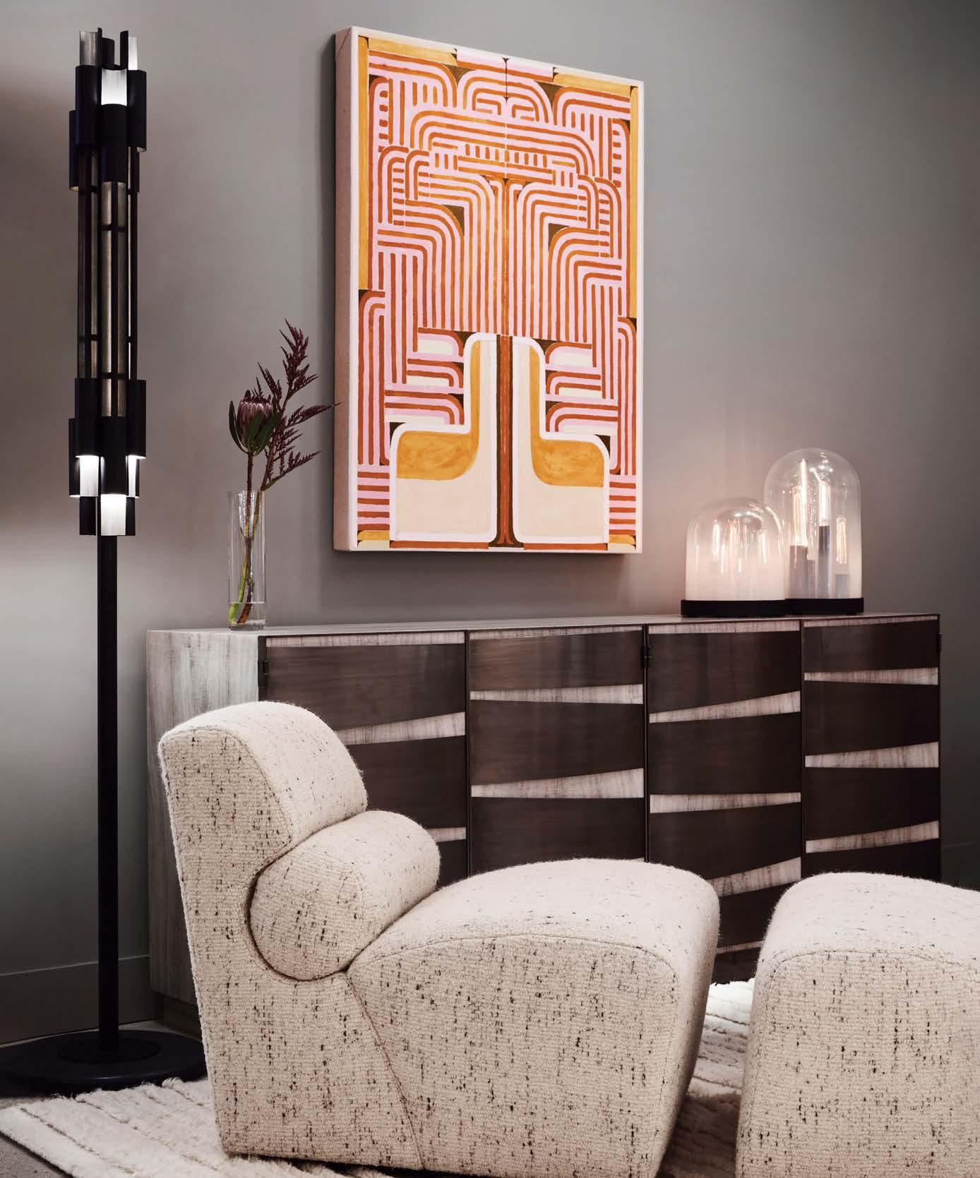 “The owners wanted to lean into the architecture and find pieces that were a little midcentury, but also very current.” To wit, the living room juxtaposes soft, welcoming chairs with the hard lines of an Arabescato Bianco marble coffee table composed of interlocking triangular forms—an example of what Wollack describes as “functional yet architectural pieces” that make a statement without overpowering the space. And some of the fabrics were inspired by the fashionable elegance of suits, Zwickl adds, pointing out the living room sofa’s flannel hopsack material.
