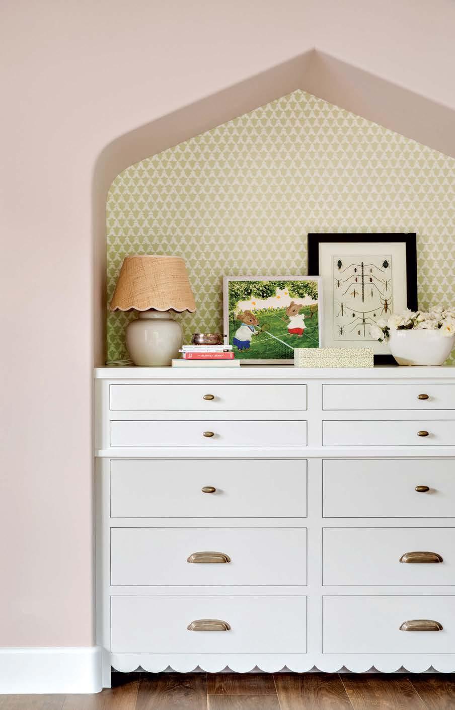 Left: The daughter helped select the colors and patterns for her bedroom, including a Galbraith & Paul wallcovering lining a niche with a built-in dresser. A Serena & Lily table lamp plays off the furnishing’s scalloped detailing.
