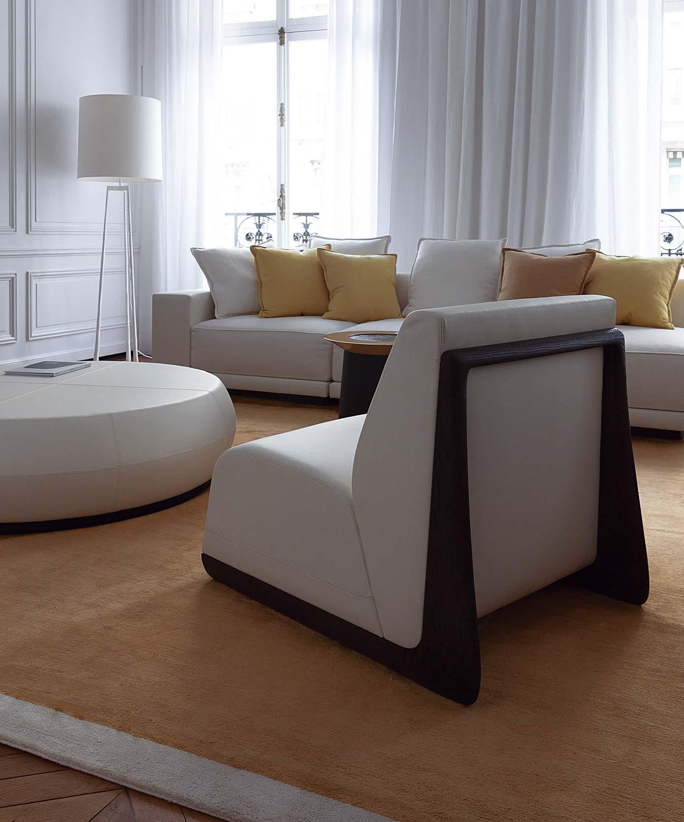 Apparatus’ sculptural Portal marble coffee table is central to the living room’s seating options: a Billy Cotton sofa, Atelier De Troupe’s Jia chairs and a Blackman Cruz bench, all atop an Armadillo rug. The artwork is by Minjung Kim.