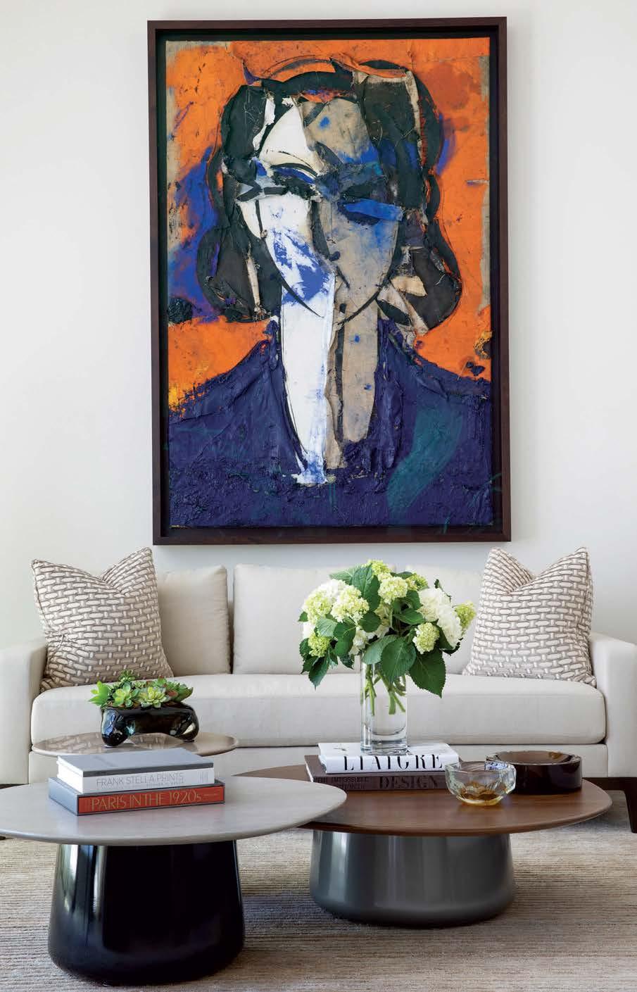 Right: A Manolo Valdés painting hangs above the living room sofa, which designer Andrew Petronio found at Dennis Miller New York and upholstered with Holland & Sherry fabric. The trio of coffee tables is by Holly Hunt Studio.