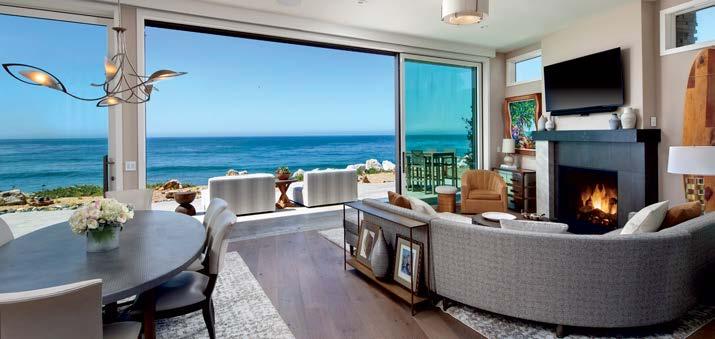 Most important to the renovation was celebrating the surrounding sun-dappled hills and valleys through enhanced indoor-outdoor living. The H-shaped form of the home, centered around a large swimming pool, allows for a separation of public and private spaces while offering 360-degree views. “We developed a plan with huge windows and pocketing doors so they could feel as though they’re part of the landscape even when inside,” Jones Ghajar says. “This was part of why they bought this property in the first place.” Complementing the newly designed residence, landscape architect James Bradanini sited Mediterranean-influenced plantings around the oak trees that survived the fire. “I selected droughttolerant plants like lavender, sage, ornamental grasses and olive trees due to their ability to thrive in the hot, dry conditions,” he explains.
