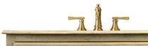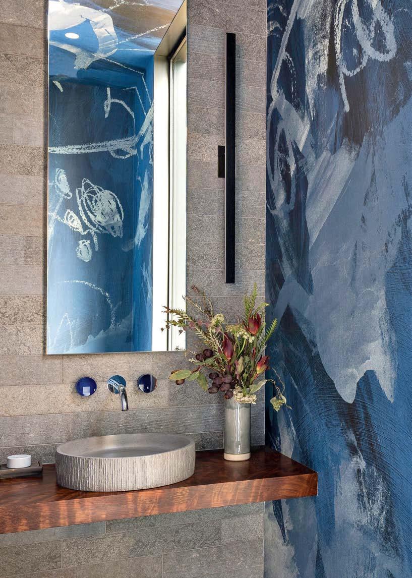 center stage. At other times it adds drama, like the powder room’s indigo-and-gold wood-veneer wallcovering and jaw-dropping blue granite sink, which play against brass mirrors and pendants.
