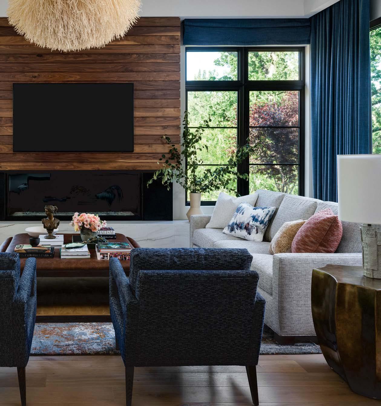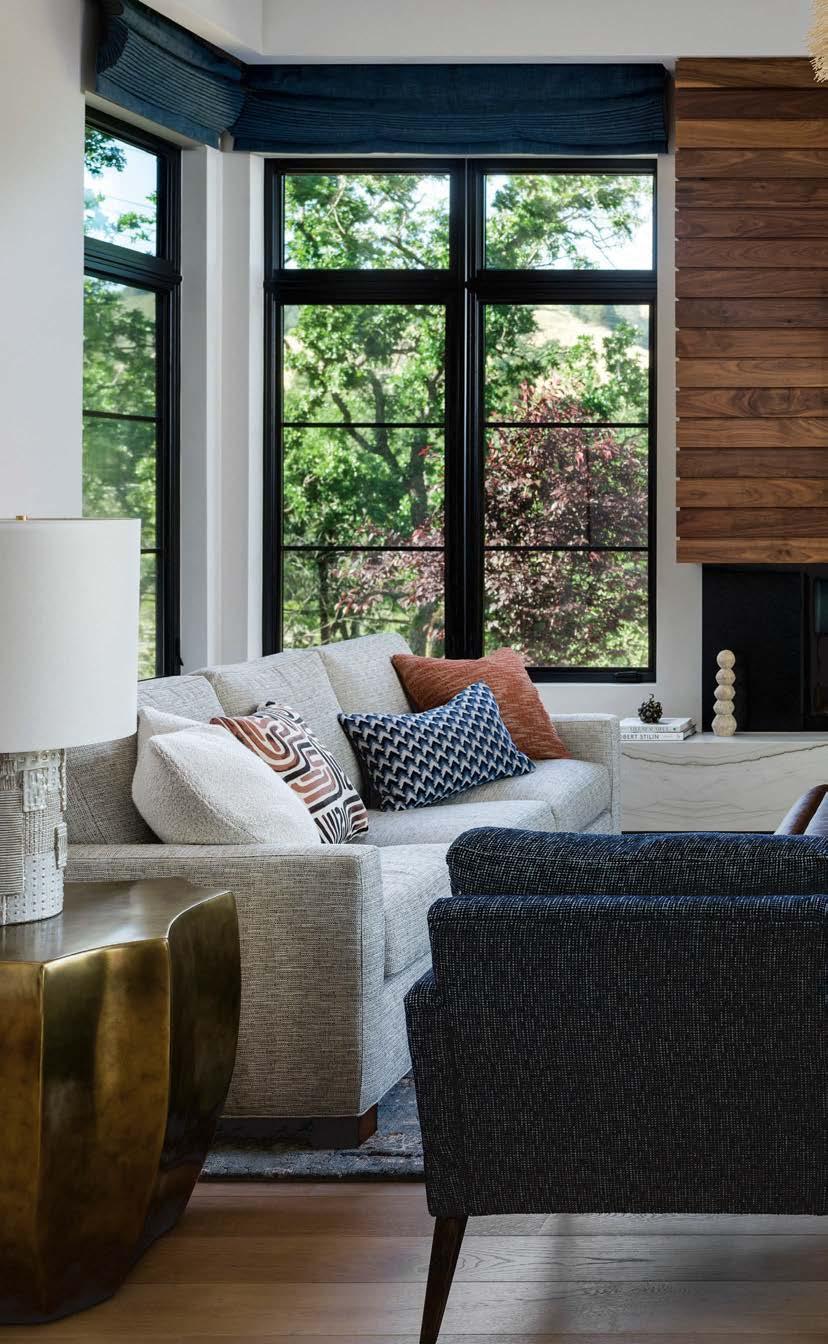 Neve balanced modern moments in the home with organic touches, such as the walnut-clad fireplace, Coup Studio Sea Urchin pendant and stone-colored Century Furniture sofas in the great room. Kravetupholstered armchairs play to the navy Nobilis linen drapes.