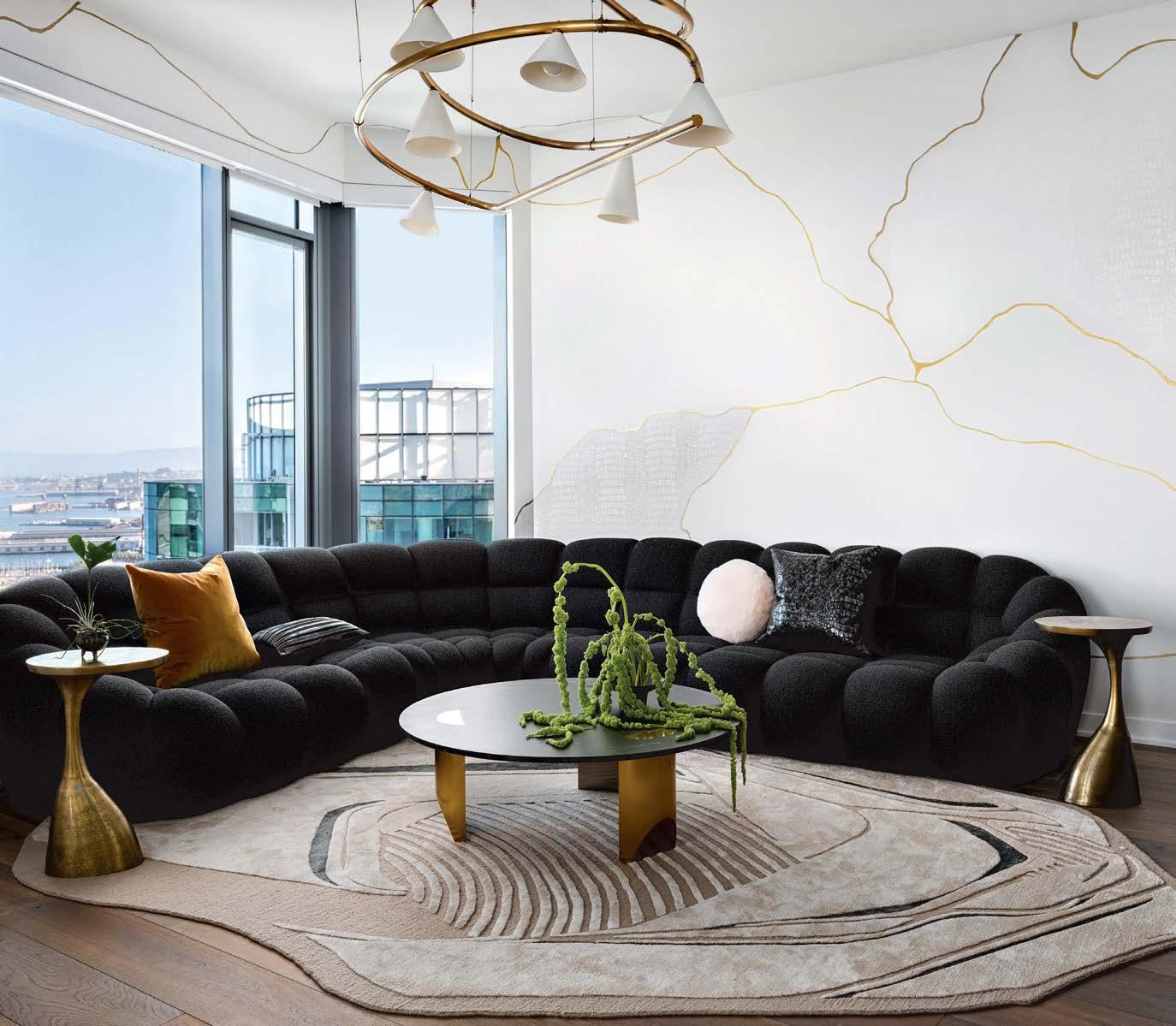 ON THE COVER: In a luxury San Francisco high-rise, designer Noz Nozawa married angular architecture with the curving lines of a Roche Bobois sectional and an Art + Loom area rug. A France & Son coffee table and serpentine Currey & Company side tables add brass accents while a sculptural Anna Karlin light completes the space. Page 166 166
