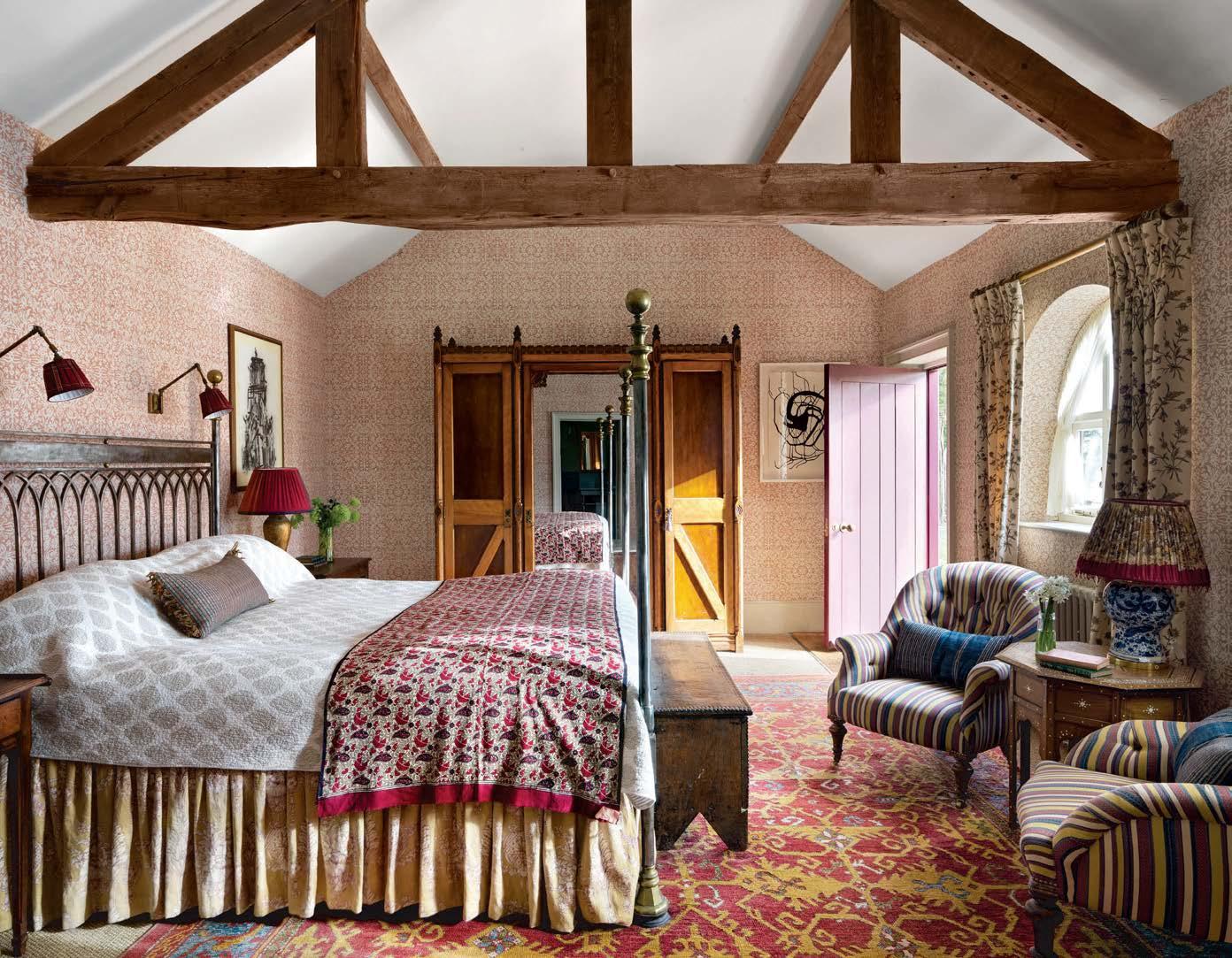 But it’s the main bedroom—with its handpainted wallpaper in charcoal, dove gray and sage on an ivory backdrop, and curtains that morph from cream to deep teal—where Neve took the fun to another level. “The drapes are beautiful—they are a big moment,” he says. “They are balanced by softer wallpaper, which makes the room soothing.”