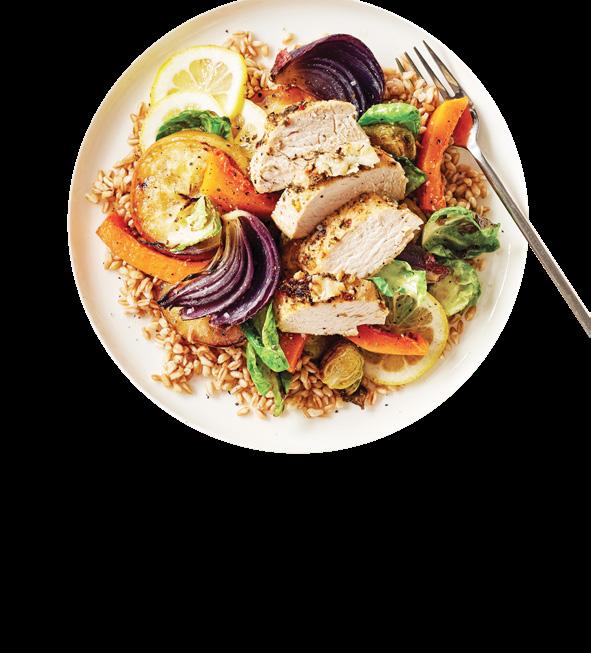 Serve chicken with farro, vegetables, and apples. Garnish with lemon slices, if desired.