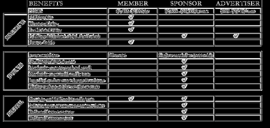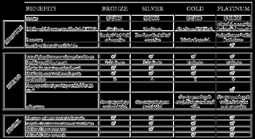 We offer four distinct sponsorship tiers, each crafted to meet different goals from targeted brand exposure to deeper, high-touch partnership opportunities Every tier includes a curated set of benefits across live events, print and digital media, and brand recognition within the Network, with increasing levels of visibility, access, and exclusivity at each level.