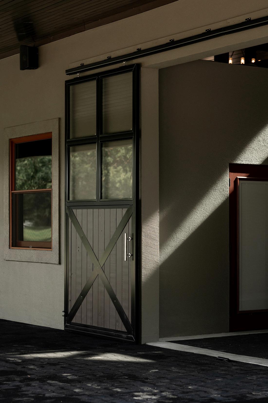 A set of grand sliding barn doors anchors the structure complete with the same quad-pane glass panels above and a bold crossbuck detail below, reminiscent of classic American barns These doors serve as a fitting centerpiece to the facility’s exterior, offering both visual drama and lasting performance