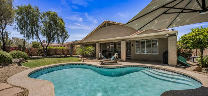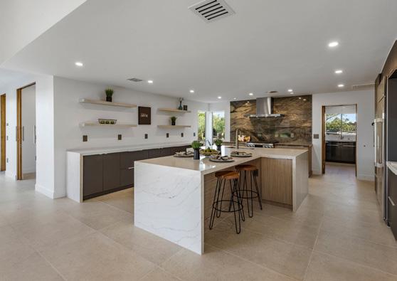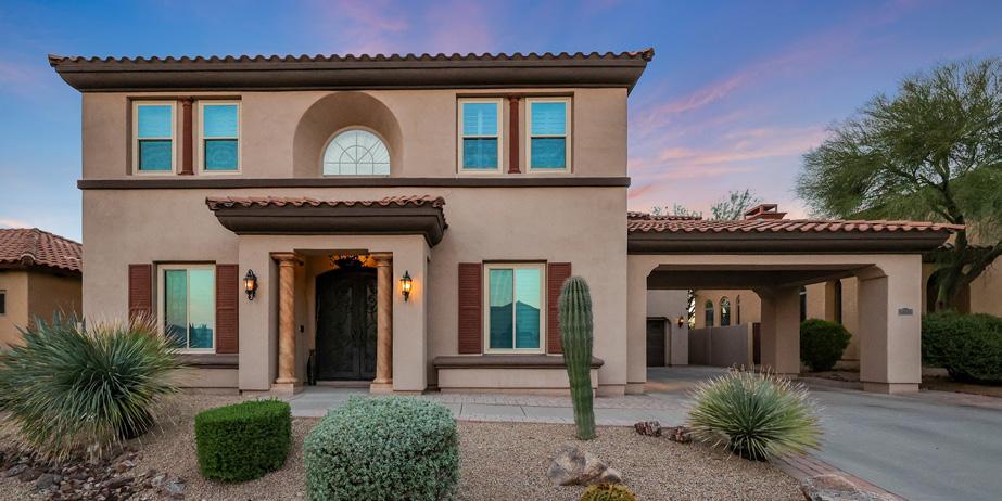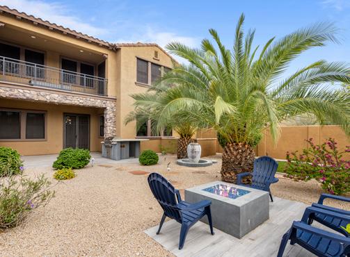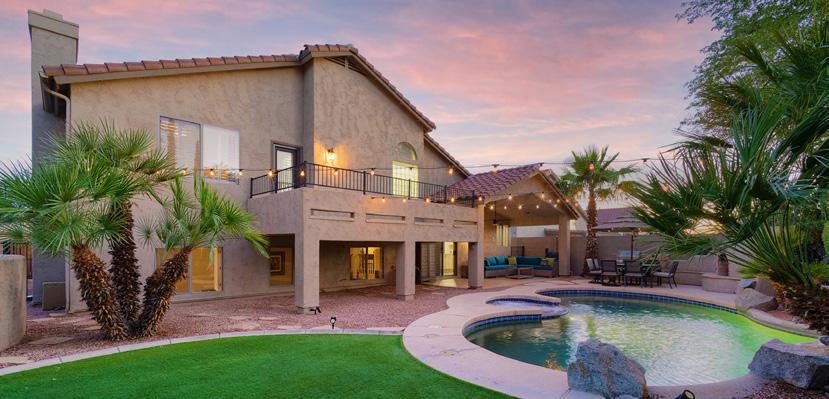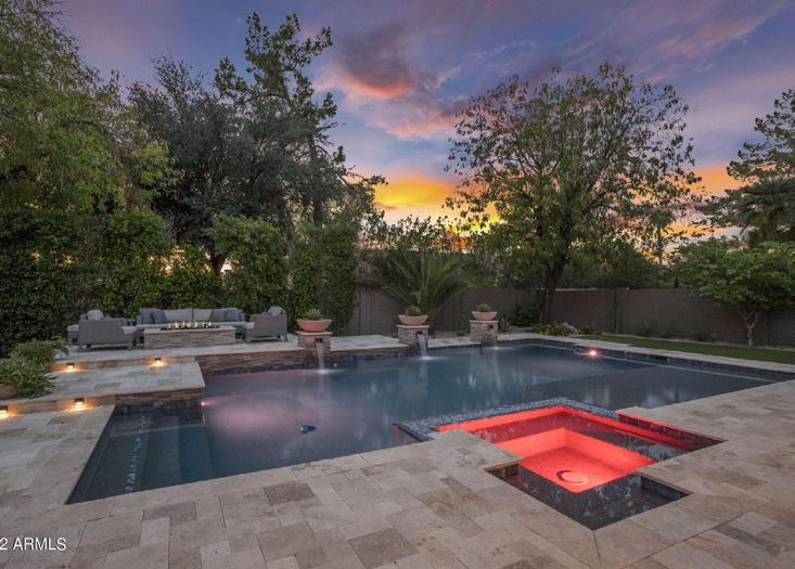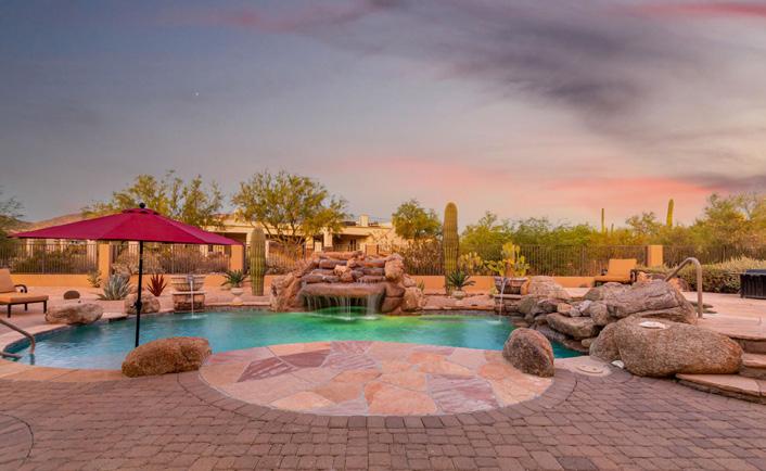 spaces, a generously sized great-room with moving glass wall opening to the resort like backyard. A beautiful grand staircase leads you upstairs where an oversized owners suite is totally separate from three additional bedrooms and two bathrooms. The owners suite was remodeled to include a bedroom that now serves as a grand closet / dressing room with custom built in cabinetry. The backyard oasis is an extension of the living space, with a full gourmet outdoor kitchen equipped with all stainless steel appliances (oven, grill, fryers, warming drawers). All gas fire pits illuminate the pool and pool house with bathroom. 32022 N 20TH LANE, PHOENIX | $1,199,995