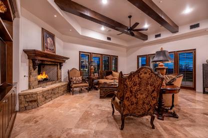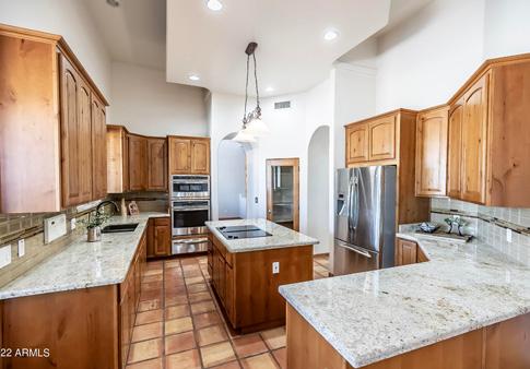 Backing to an expansive arroyo with southern exposure of the city lights, Sonoran Desert, & sweeping views. Open concept featuring vaulted ceilings, oversized windows, & plenty of spaces for living, dining, and entertaining. Great room features fireplace & media center. Kitchen features a gas cook top, stainless-steel appliances, granite peninsula.