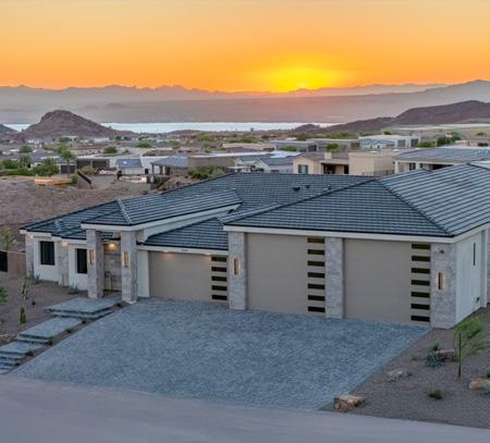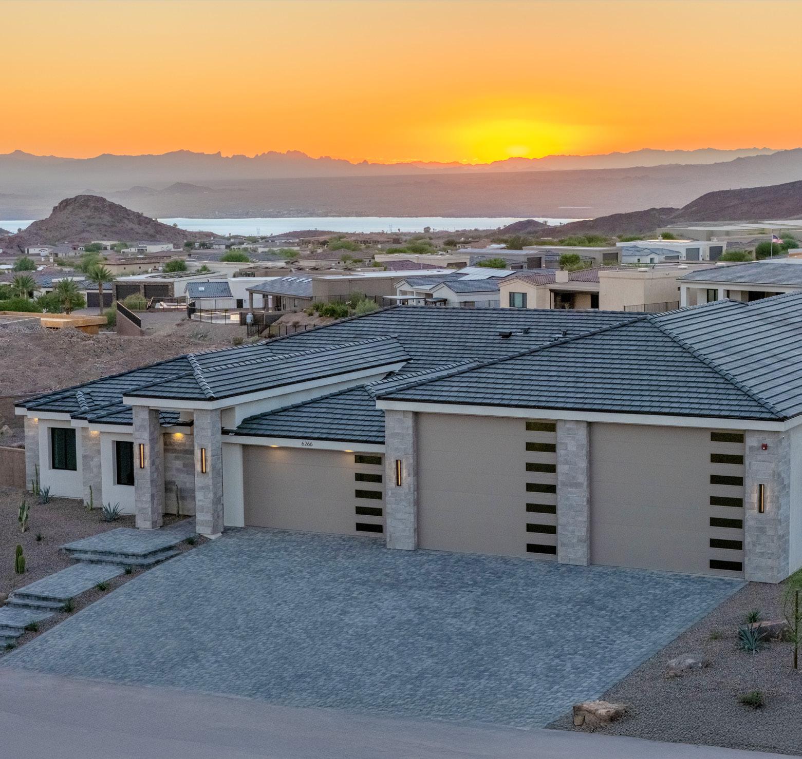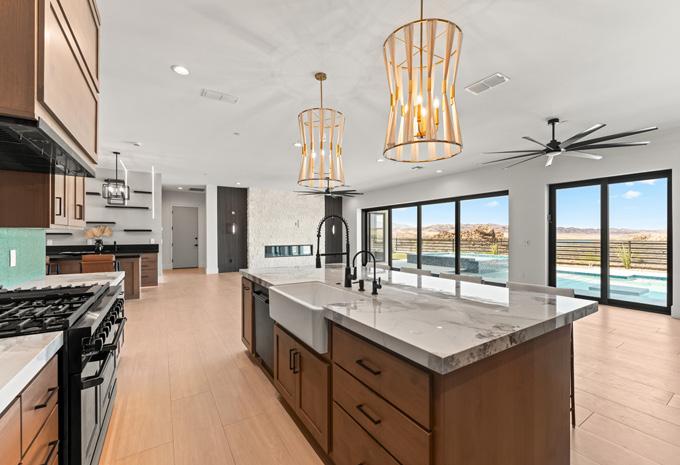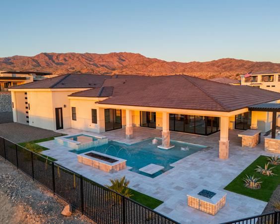 LOCATED BEHIND THE GATES of Ladera South at Havasu Foothills Estates, this cul-de-sac luxury residence captures serene lake views and seamless indoor-outdoor living. Expansive corner stackable sliders open to a resort-style backyard featuring a custom pool and spa, built-in BBQ, gas fire pit, and dramatic fire-and-water features—perfect for entertaining.