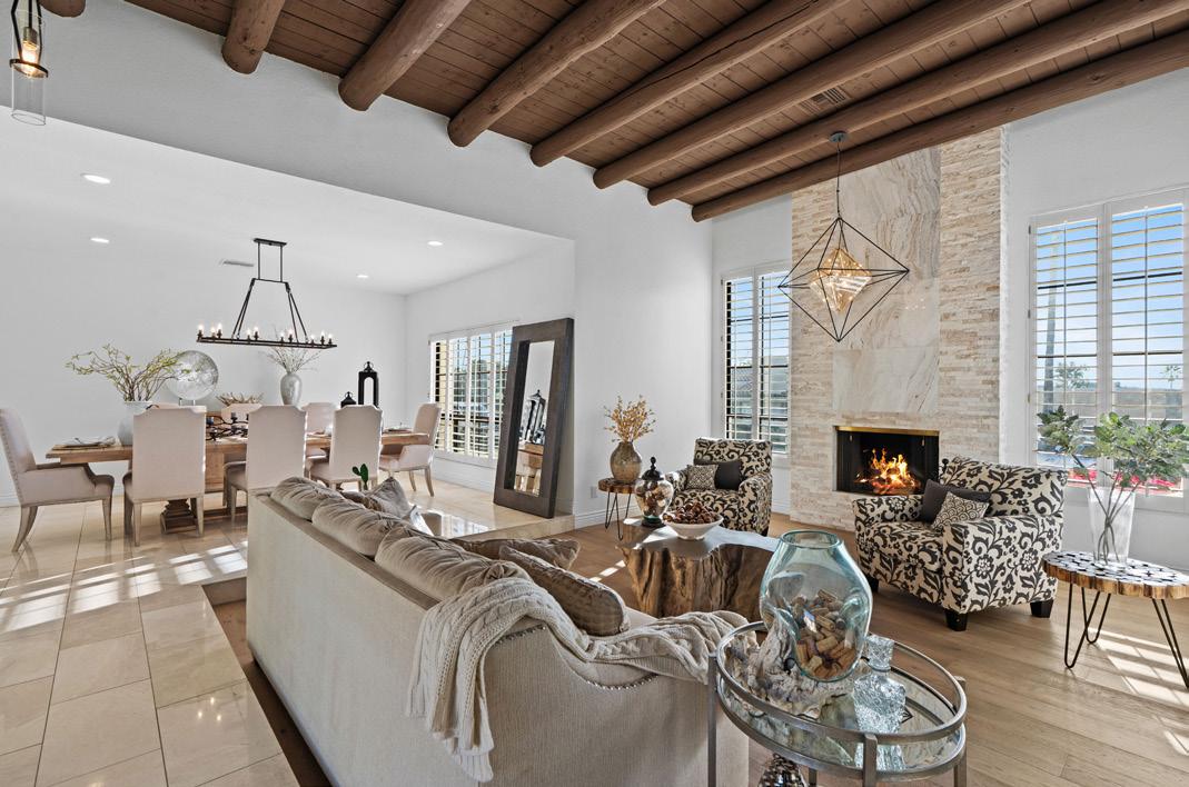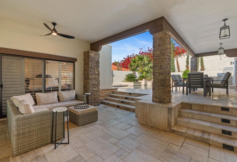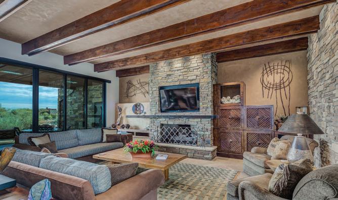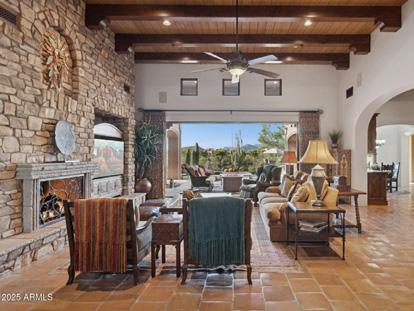 Throughout, appreciate refined elegance with nine charming fireplaces, custom wood flooring and distinguished beamed ceilings, gracious brick and tile accents and a wet bar with wine wall reflect the home’s attention to detail and artistry. Every space tells a story of craftsmanship, comfort, and connection—to the desert, to the sky, and to the