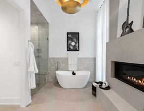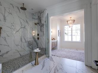 The primary suite embodies a quiet, luxurious retreat. Heated, book-matched marble floors, a freestanding Carrara marble soaking tub, and custom closets designed by LA Closet Design transform daily routines into moments of indulgence. His-and-her wardrobes with built-in beverage centers, laundry, and safe rooms ensure convenience is as seamless as elegance.