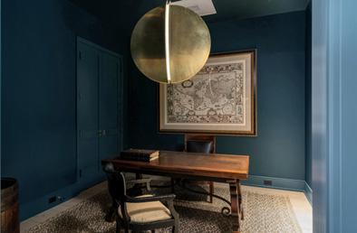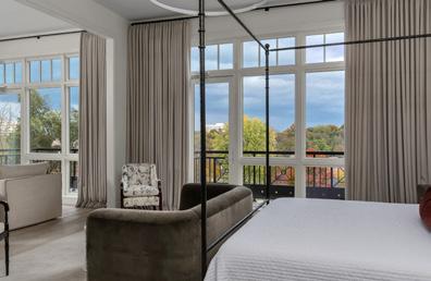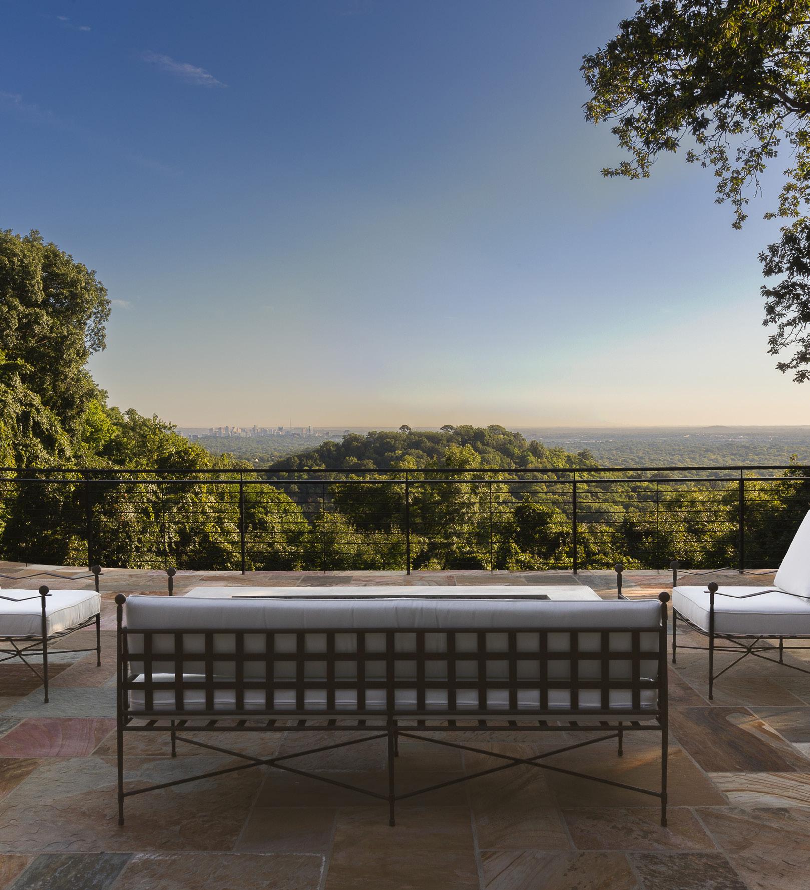 Step inside, and light becomes a principal architect. Walls of full-height glass frame panoramic views of the city skyline while flooding interiors with natural warmth. Throughout the home, every surface, every finish, and every detail speaks to a refined sensibility—where craftsmanship is as essential as design. Handcrafted Iron Lion doors, reclaimed ceiling beams from a historic mule barn, and pecky-cypress accents create an environment that is at once intimate and monumental. Venetianplaster walls inlaid with leather in the dining room, custom-forged bronze stair railings, and a Rumford wood-burning fireplace clad in French antique
