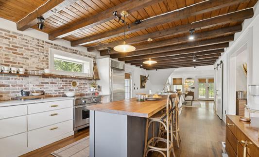 The main residence, encompassing approximately 10,584 square feet, exudes elegance at every turn. Four to five bedrooms, four full baths, and two half baths provide expansive living spaces, while walnut floors throughout anchor the home in warmth and timeless beauty. The gourmet kitchen is a chef’s dream, featuring leathered marble countertops, a seamless granite island, Sub-Zero refrigeration, a LaCanche range with Japanese plancha, Asko dishwasher, and a scullery for preparation and storage. This space effortlessly blends culinary sophistication with practical design.
