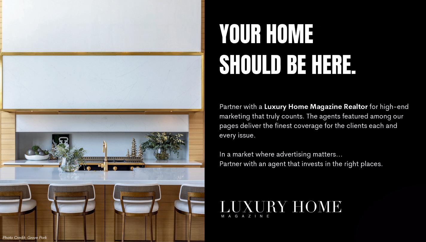 The Realtors showcased in LHM consistently demonstrate resilience, growth, and forward-thinking leadership. Rather than simply reacting to market changes, they help shape how luxury real estate moves across Middle Tennessee. Their use of premium marketing, data-driven insight, and highimpact exposure sets a new standard for representation. These are the experts you want guiding your journey—and we’re proud to collaborate with each one.