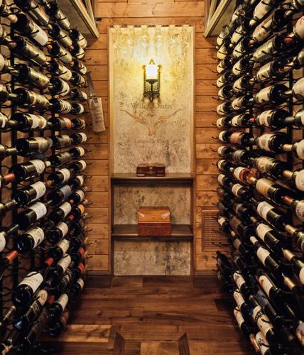 The main living area serves as the estate’s centerpiece, where a reclaimed Opryland Hotel chandelier illuminates a floating staircase and a wood-burning fireplace. A temperature-controlled, 1,000-bottle wine closet caters to collectors and entertainers alike. Artist Lynette Wright, founder of Iron Collective, elevates each room with her signature plaster and custom paint finishes, transforming walls and ceilings into visual art that imbues the home with warmth and personality.