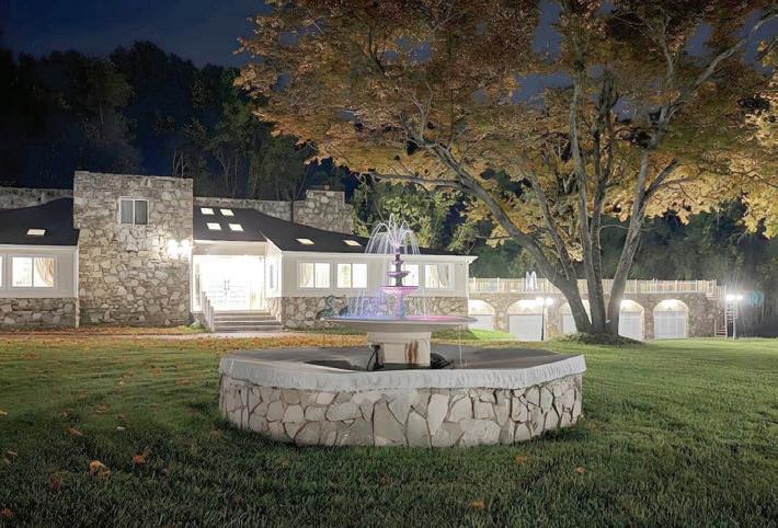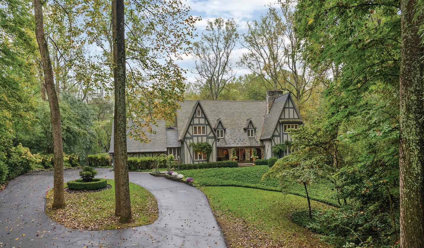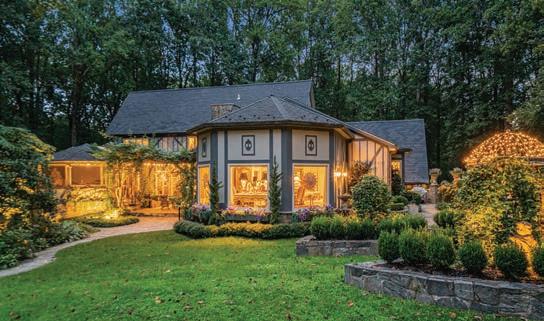 Featuring storybook architecture, the rear garden of this timeless estate is a resort-like destination, featuring stone terraces, formal gardens, fountains, and mature trees—all anchored by a resort-style swimming pool, spa, fire pit, and two custom gazebos–all backing onto 15 acres of woods.