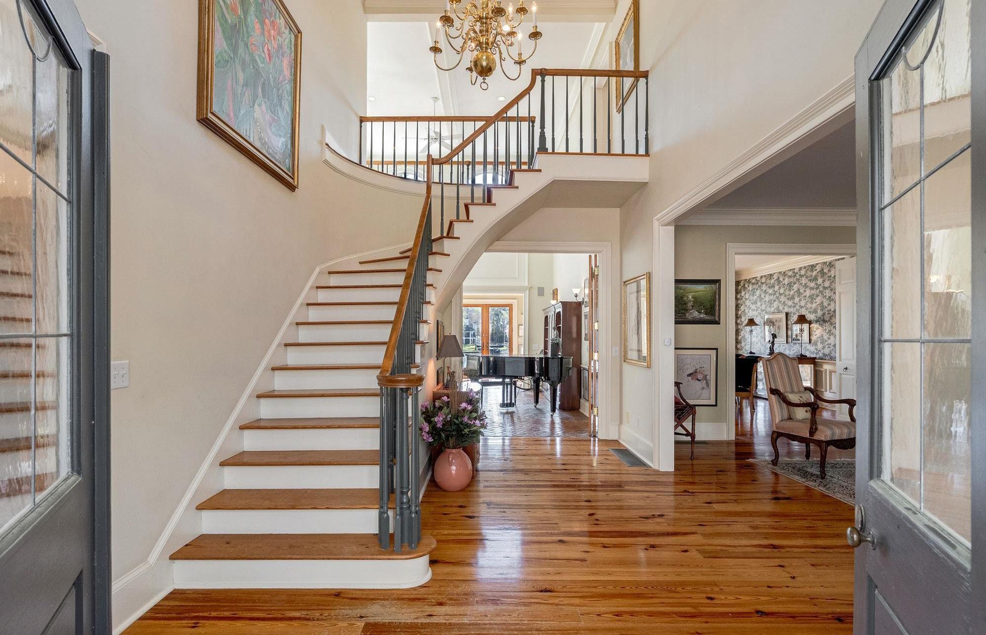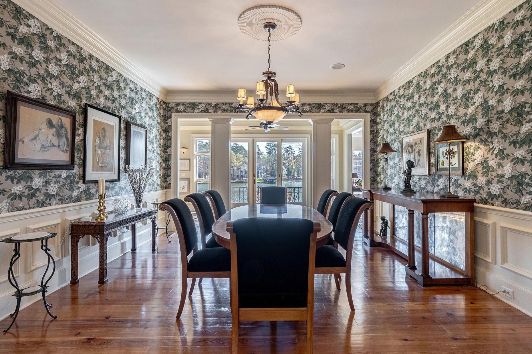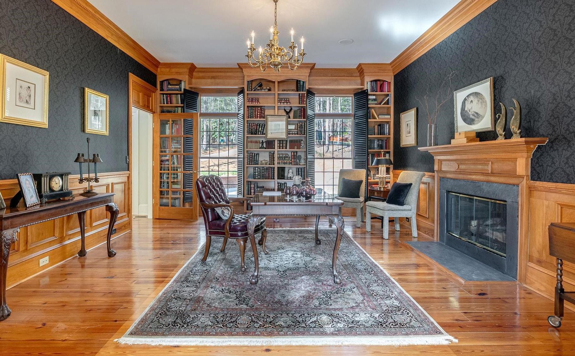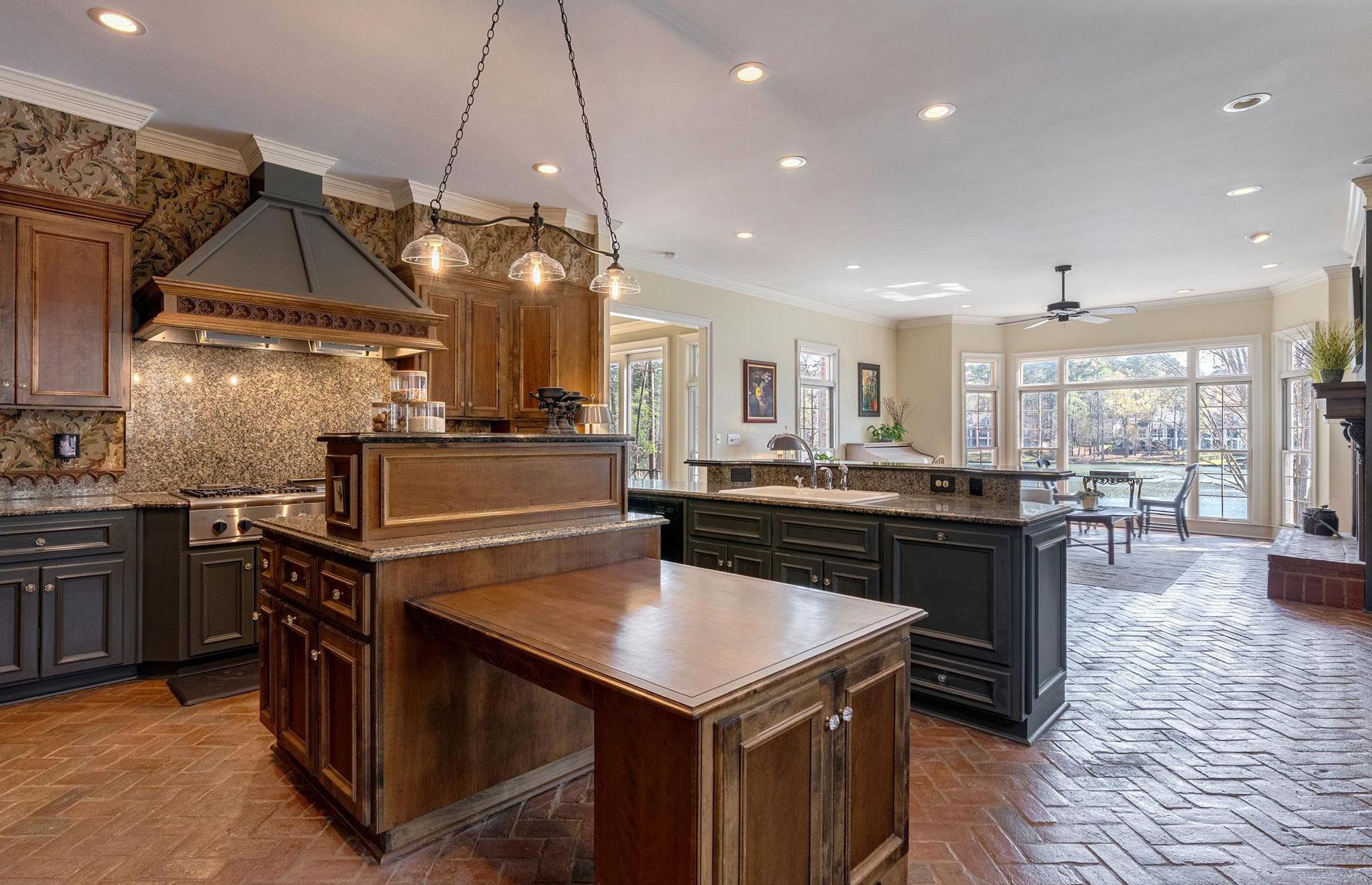 A traditional foyer opens to a conversation room and a richly finished, wood-wrapped office with a fireplace. Beyond, the great room opens with scale, anchored by a cast stone fireplace and a wall of windows that draw in the lake. The main level balances traditional spaces with an easy, connected flow, with a formal dining room just off the kitchen, creating a natural rhythm for entertaining. The kitchen is rich in character, finished with stone countertops and a wood island, and opens to a keeping room and a separate breakfast room, both lined with windows and filled with natural light. Five fireplaces throughout the home add warmth and continuity across each living space.