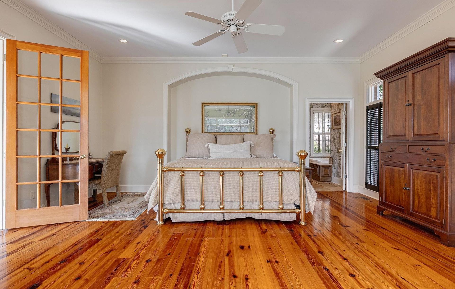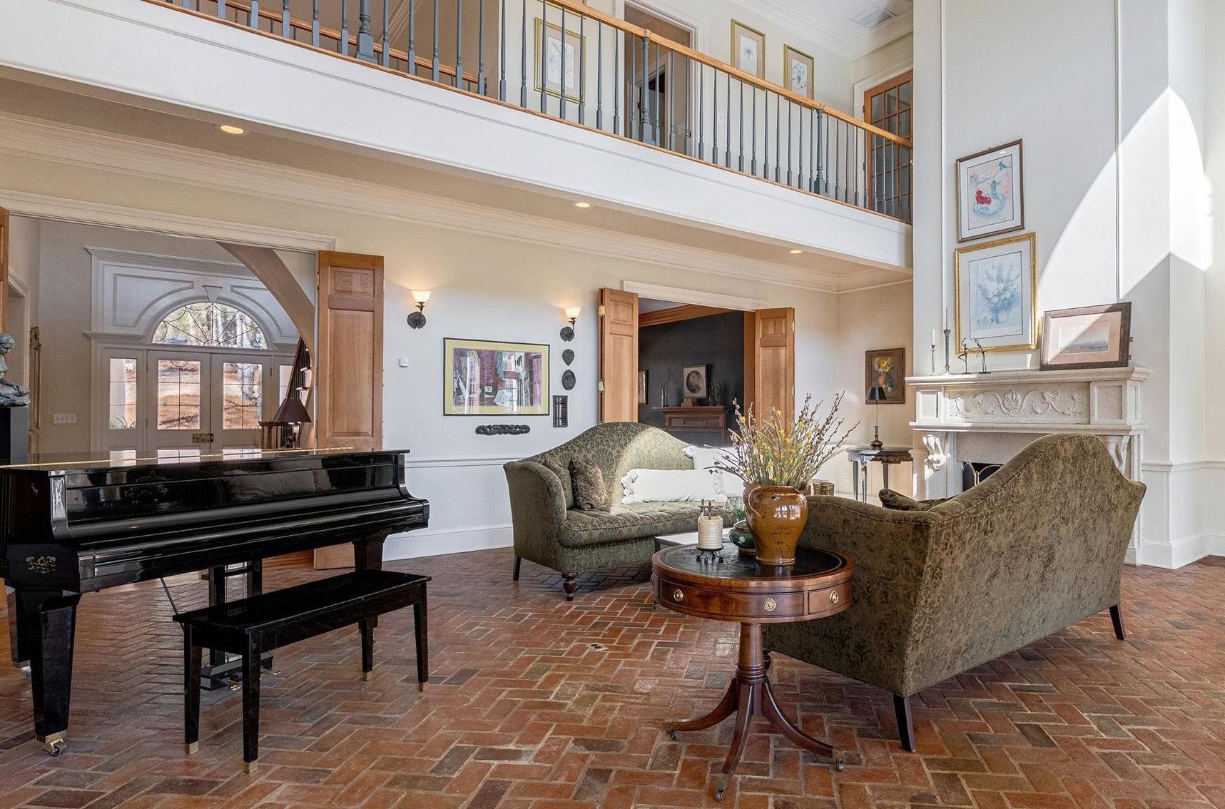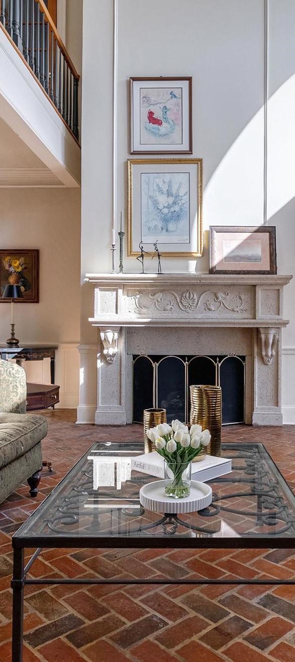 The primary suite on the main level is privately set behind French doors, featuring its own sitting area and fireplace, along with a well-appointed bath and two walk-in closets.