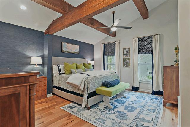 Main living/dining with full-height stone fireplace, exposed cedar beams, and wideplank white oak floors