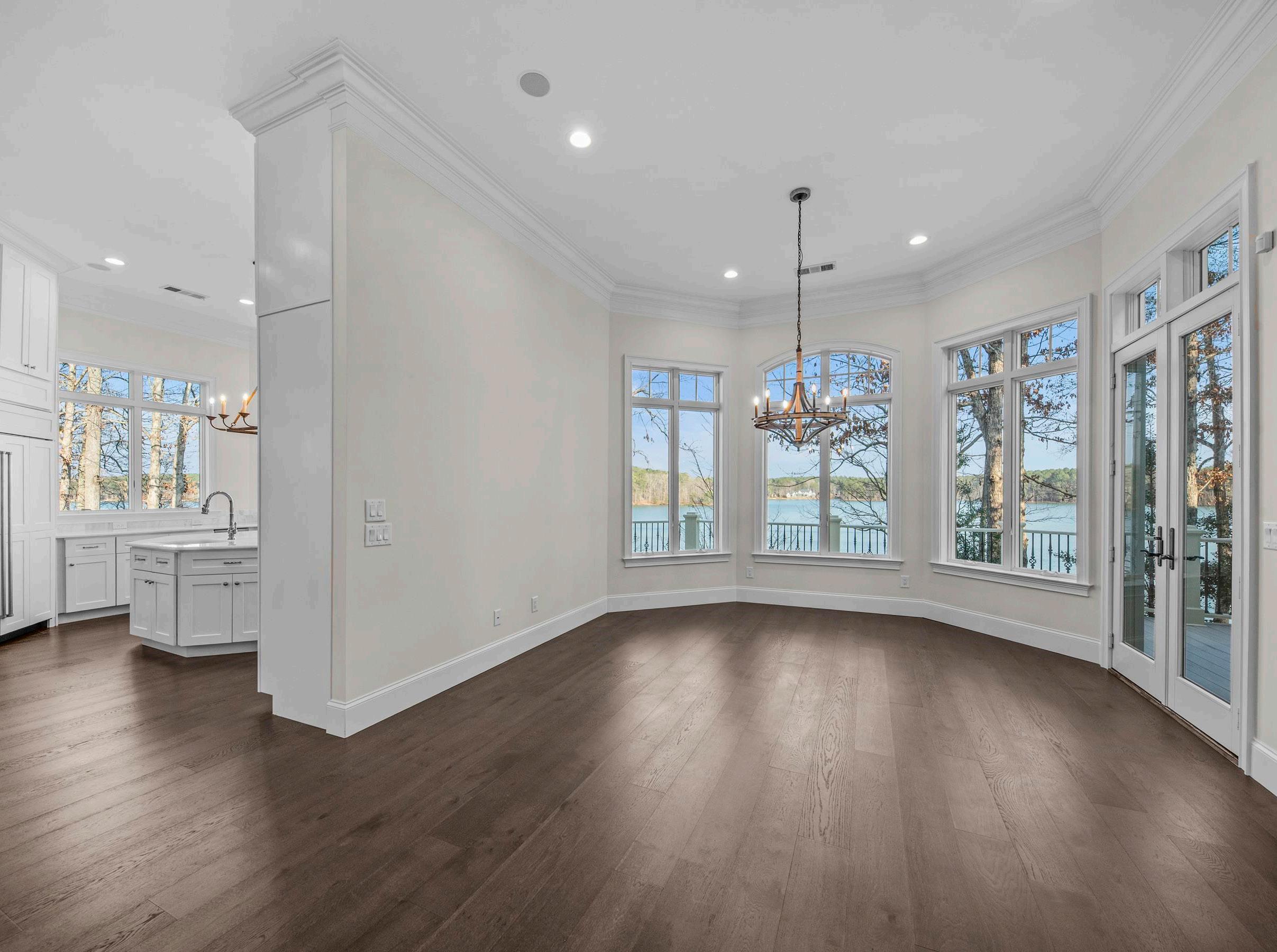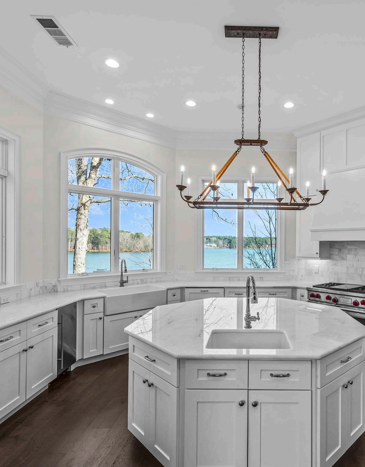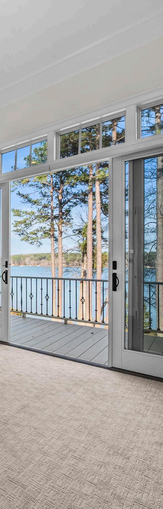 Water surrounds the property, delivering sweeping lake views from nearly every room. The residence has been comprehensively transformed, with walls removed, spaces opened, and each vantage intentionally oriented toward the water. The renovated kitchen is positioned to capture tranquil lake views from nearly every angle and features professionalgrade Wolf and Sub-Zero appliances, custom cabinetry, and crisp white stone surfaces. Just off the kitchen, a breakfast area with walls of glass frames the water. The main level also includes a vaulted great room with a stone fireplace, dining room, and home office.