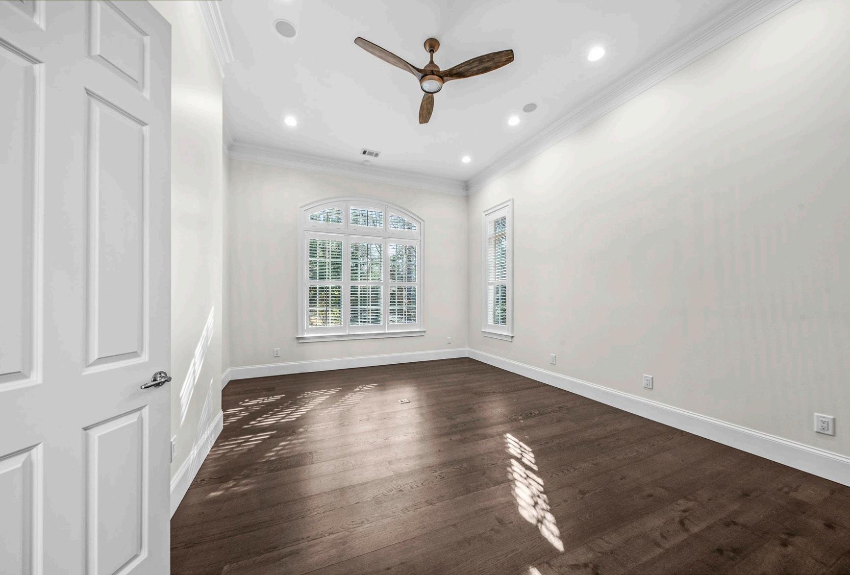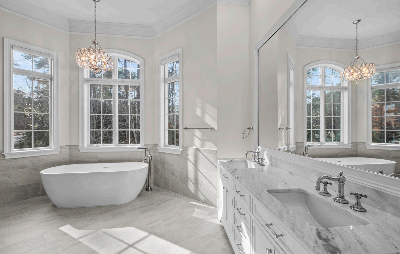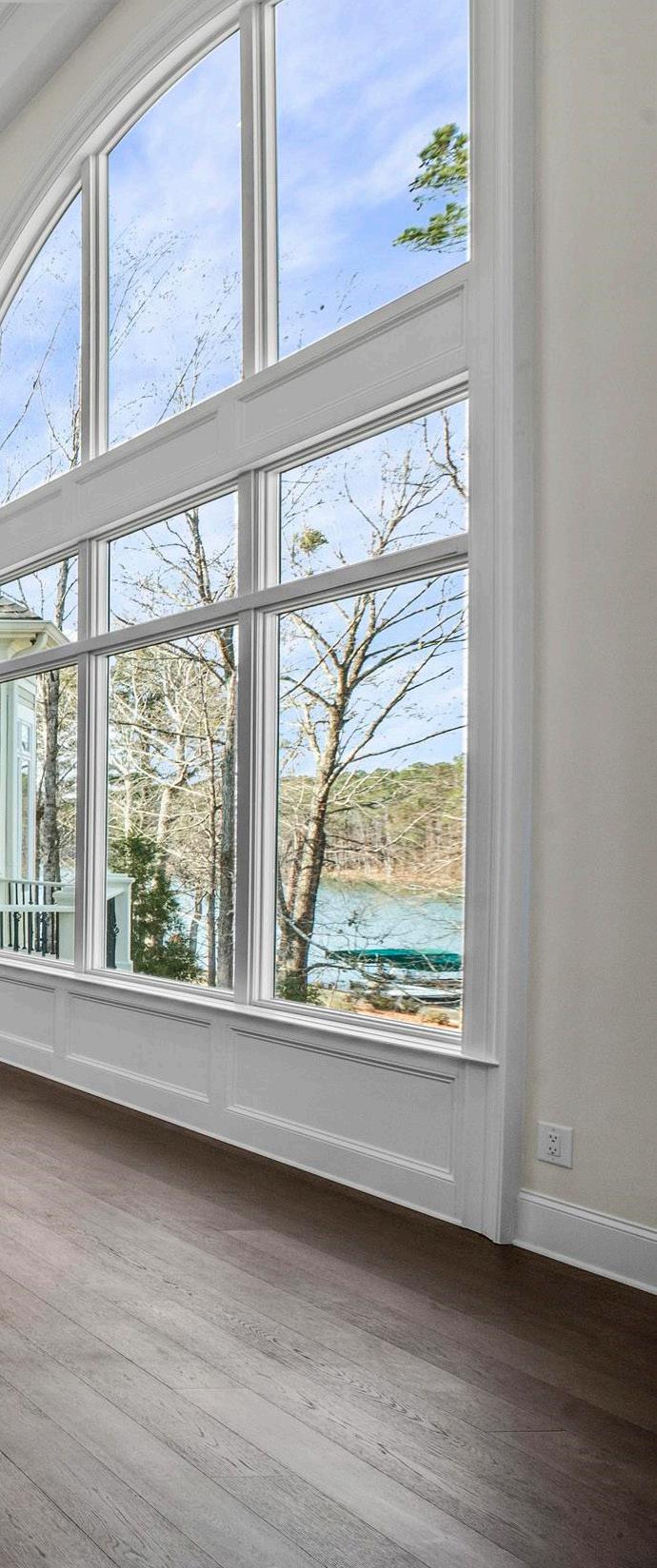 Water surrounds the property, delivering sweeping lake views from nearly every room. The residence has been comprehensively transformed, with walls removed, spaces opened, and each vantage intentionally oriented toward the water. The renovated kitchen is positioned to capture tranquil lake views from nearly every angle and features professionalgrade Wolf and Sub-Zero appliances, custom cabinetry, and crisp white stone surfaces. Just off the kitchen, a breakfast area with walls of glass frames the water. The main level also includes a vaulted great room with a stone fireplace, dining room, and home office.