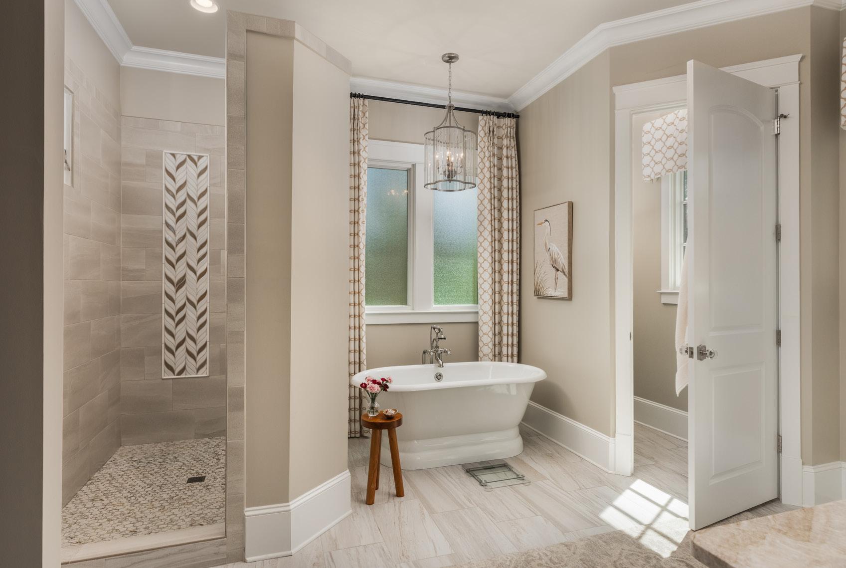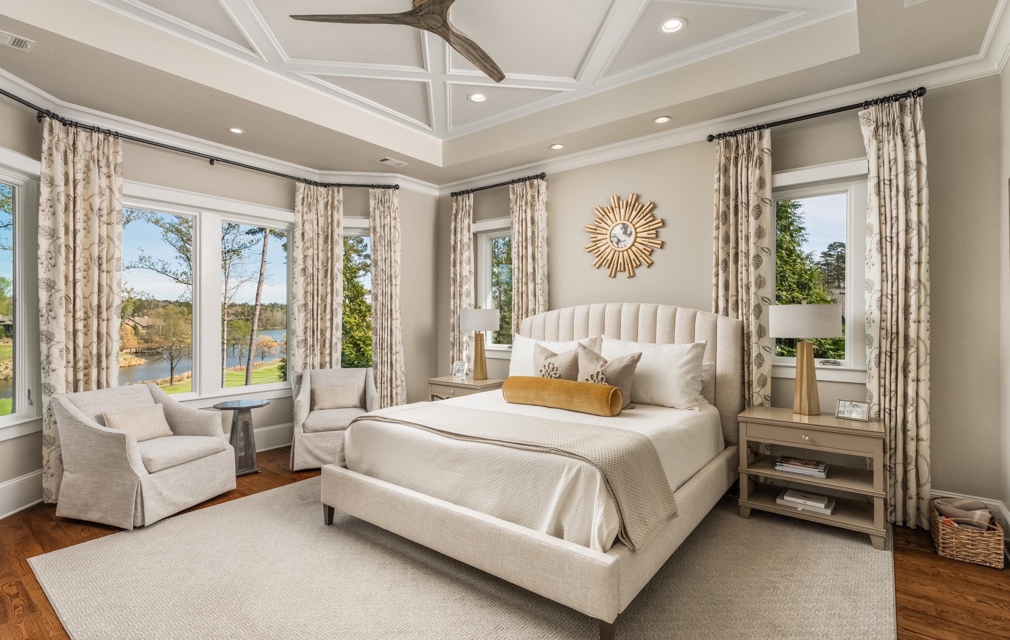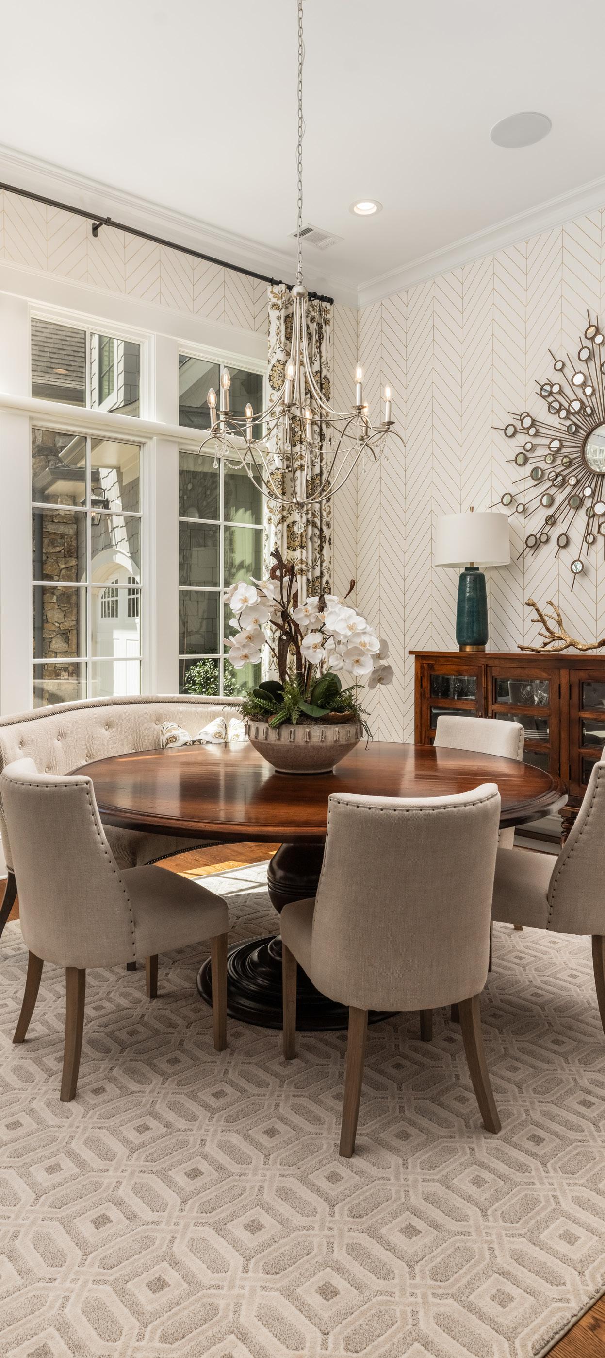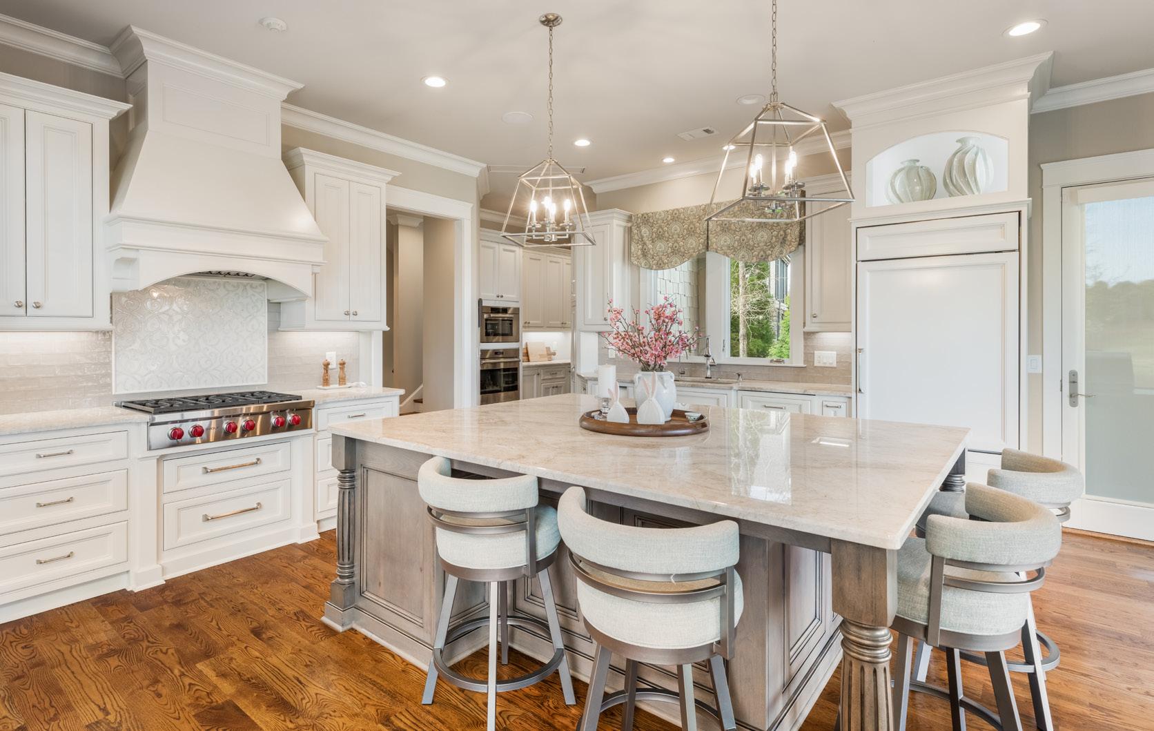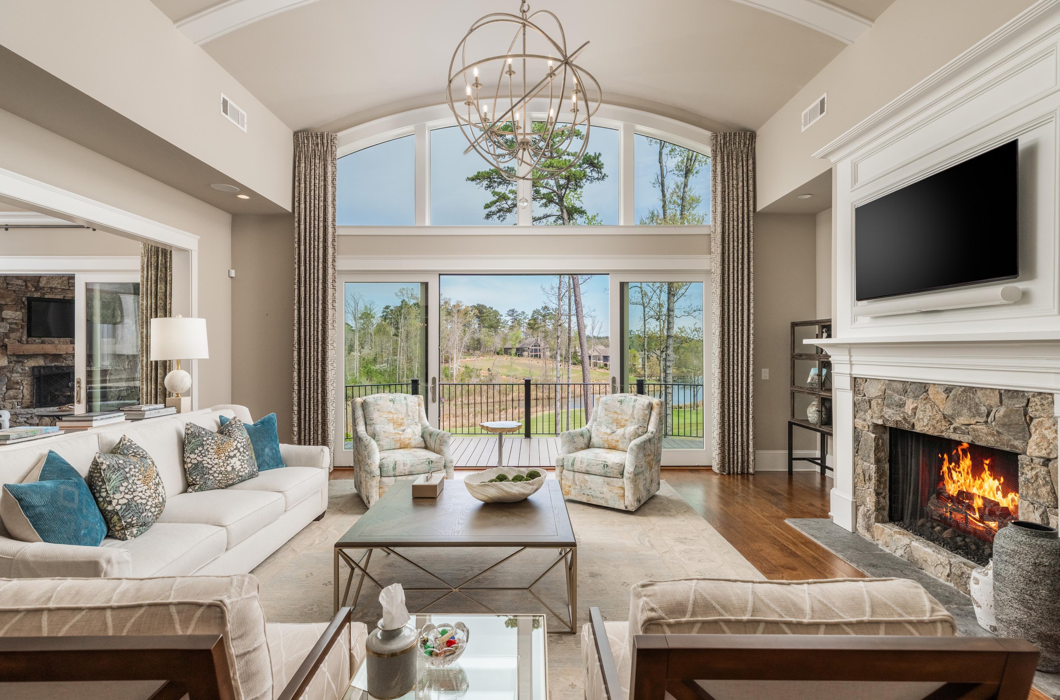 The main level opens with a natural flow designed for everyday living and entertaining. A dining room with 12-foot ceilings and designer wall coverings leads into a lightfilled great room with soaring ceilings, a gas fireplace, and expansive glass framing long views across the course and toward the lake. French sliders open to the rear porch, creating a seamless indoor-outdoor connection.