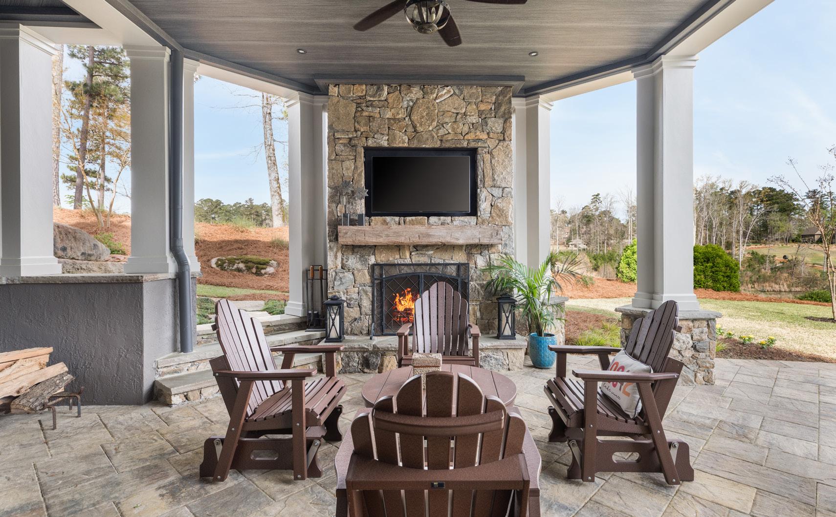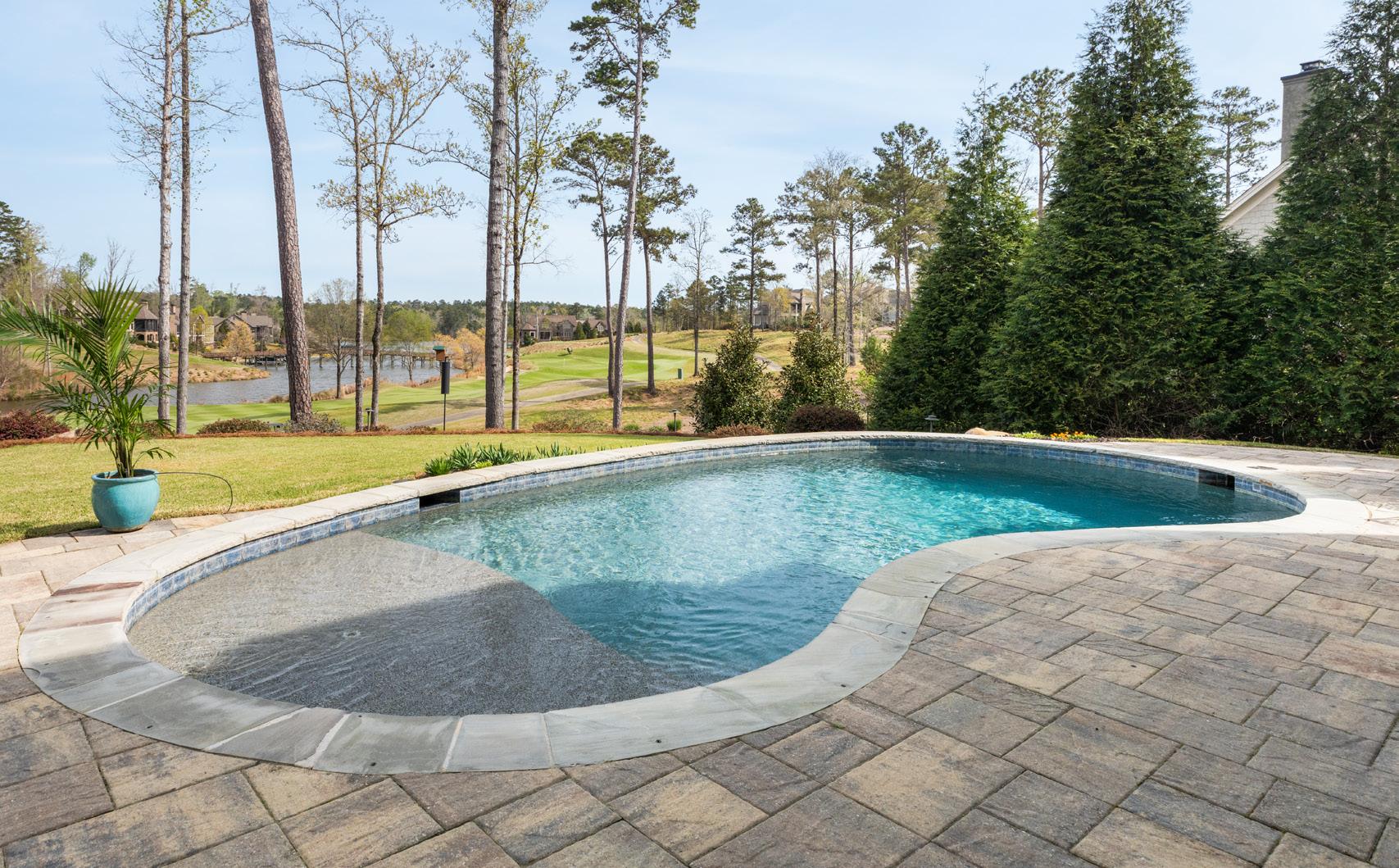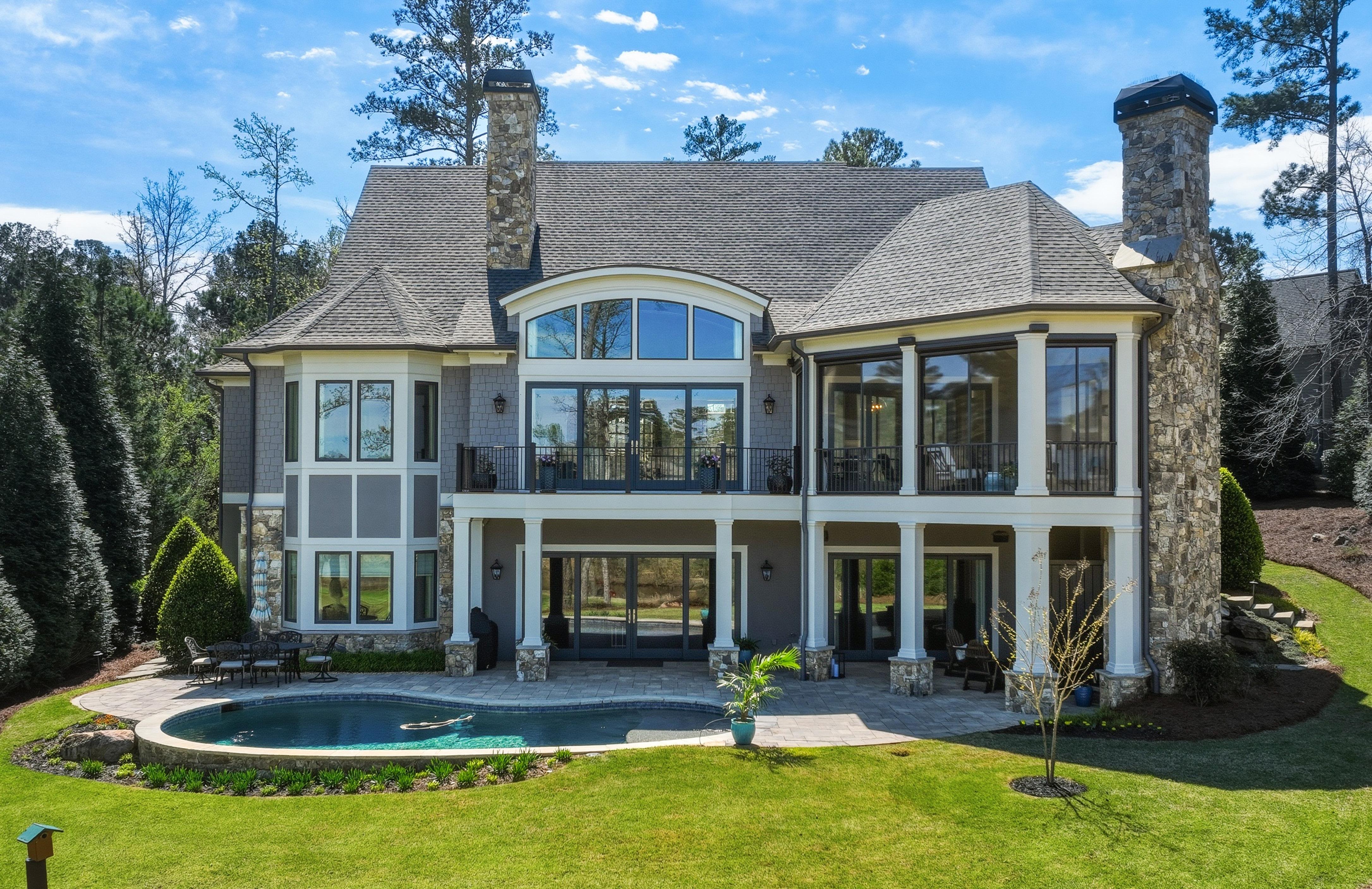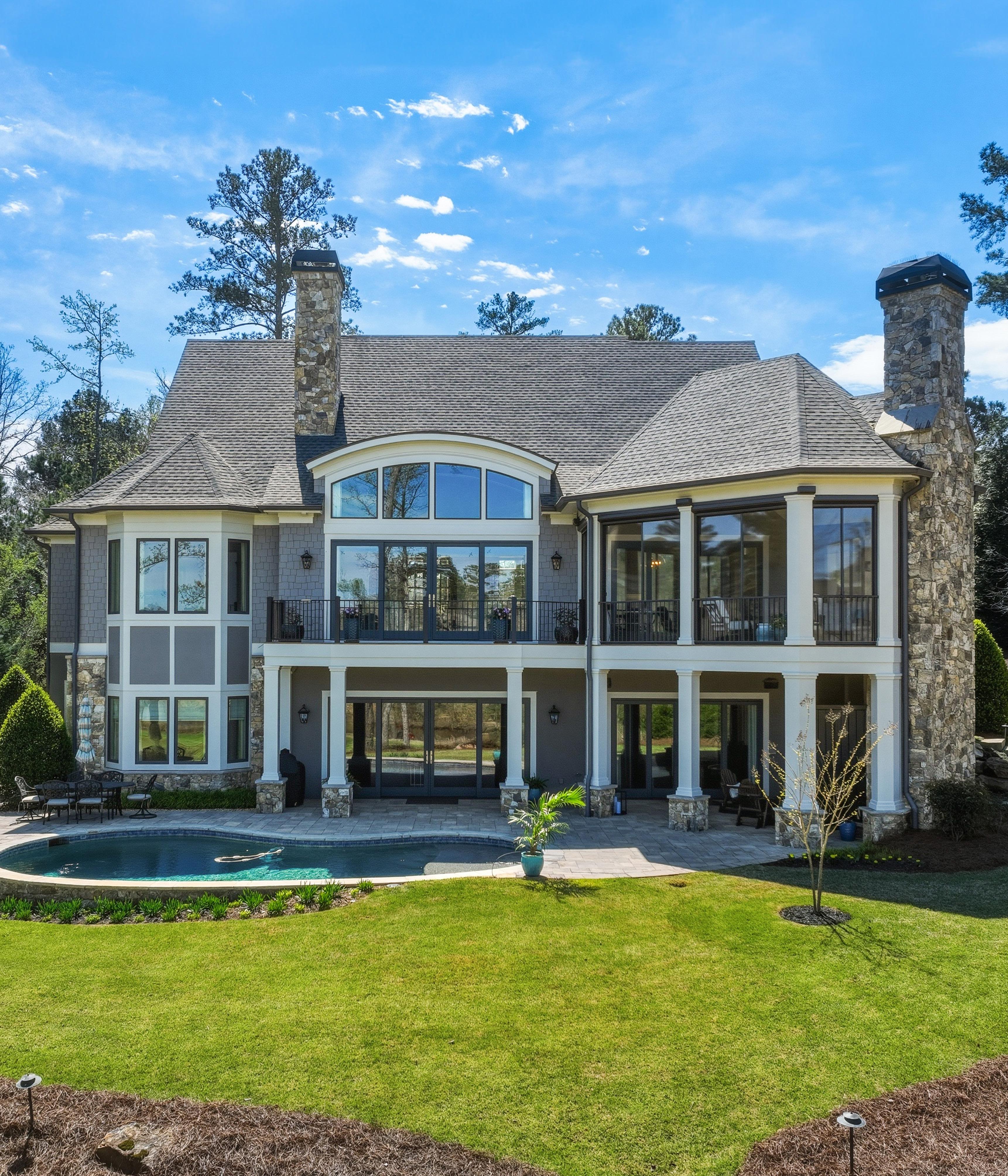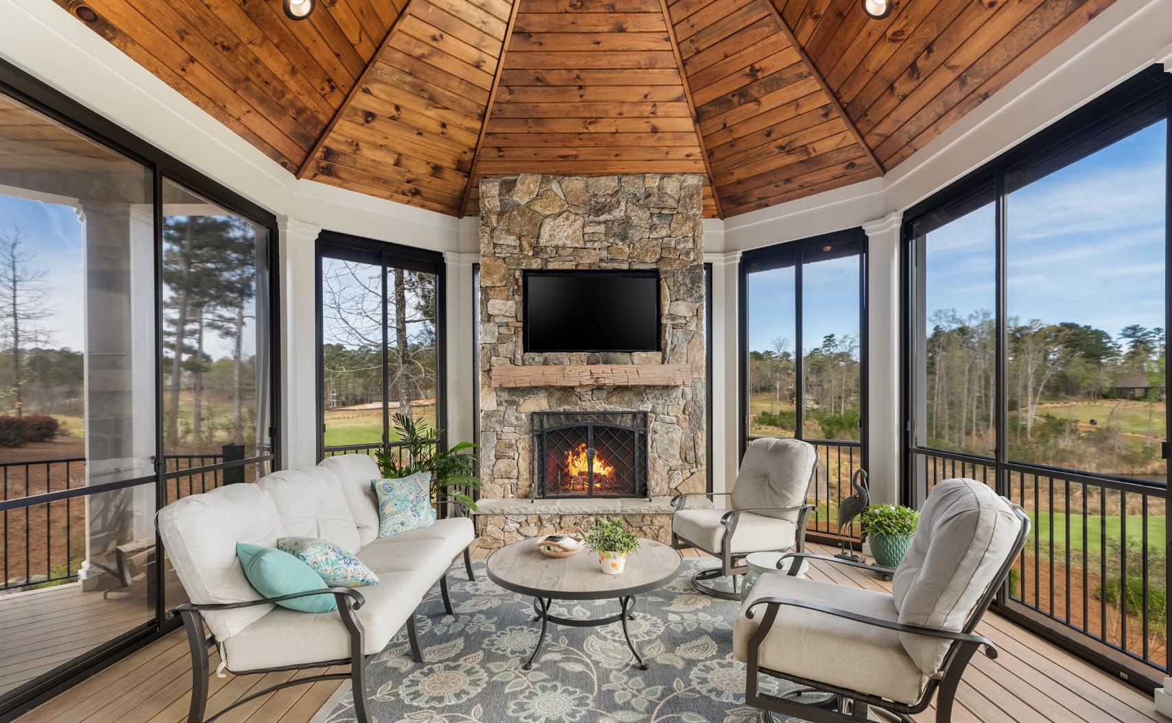 Outdoor living is layered and intentional. A screened porch features retractable screens and seasonal removable vinyl panels for year-round use. From here, access continues to the grilling deck and down to the pool terrace, where stonework, mature landscaping, and a wide homesite create a private setting with golf and lake views.