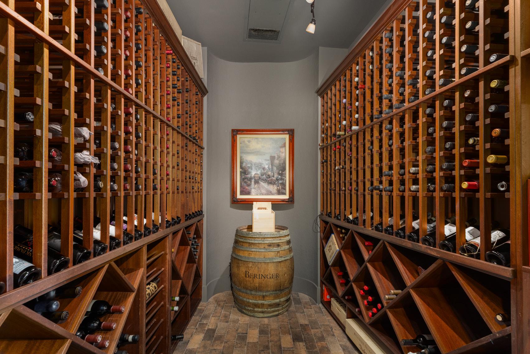 The terrace level is designed for entertaining, with a large living area, a full bar finished with leathered granite, an ice maker, and refrigeration, along with a temperaturecontrolled wine cellar holding approximately 900–1,000 bottles. Two guest suites offer privacy and direct outdoor access, and ample storage space is plumbed for an additional bedroom and bath.