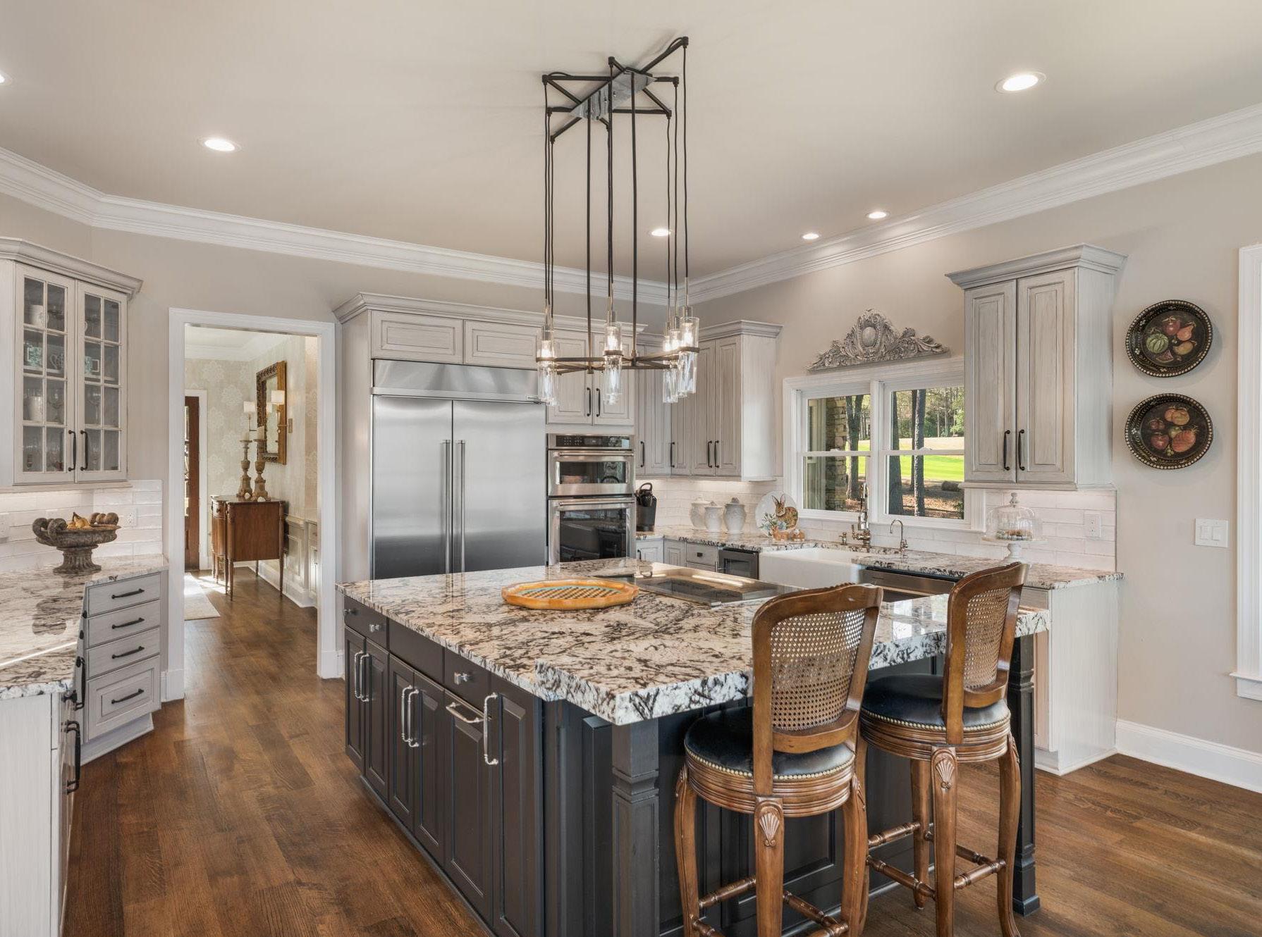 The main level is designed for both comfortable living and effortless entertaining. The open great room and dining area feature newly installed limestone fireplaces and flow seamlessly into the gourmet kitchen, all positioned to capture panoramic views of the water and the signature golf hole.