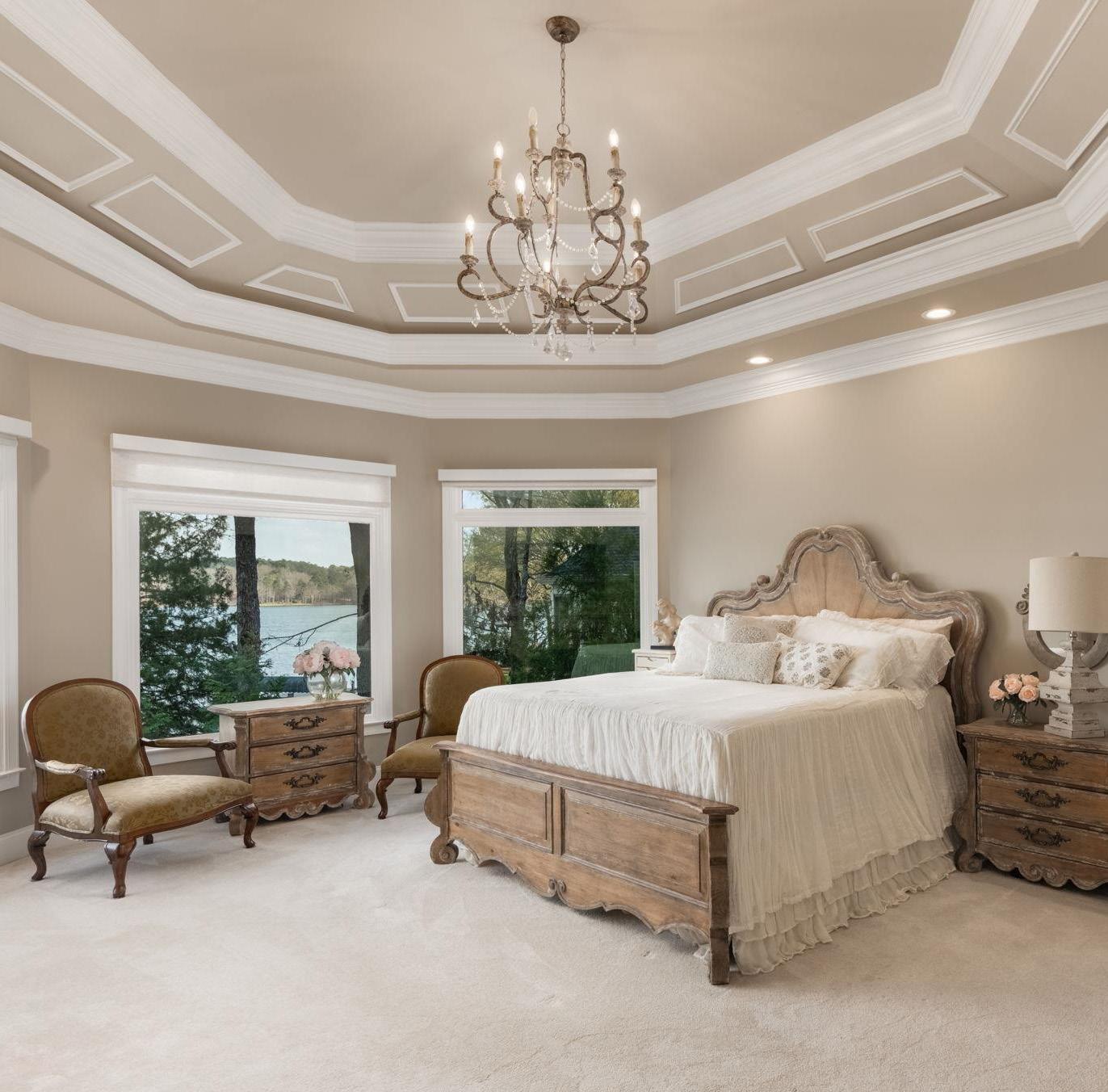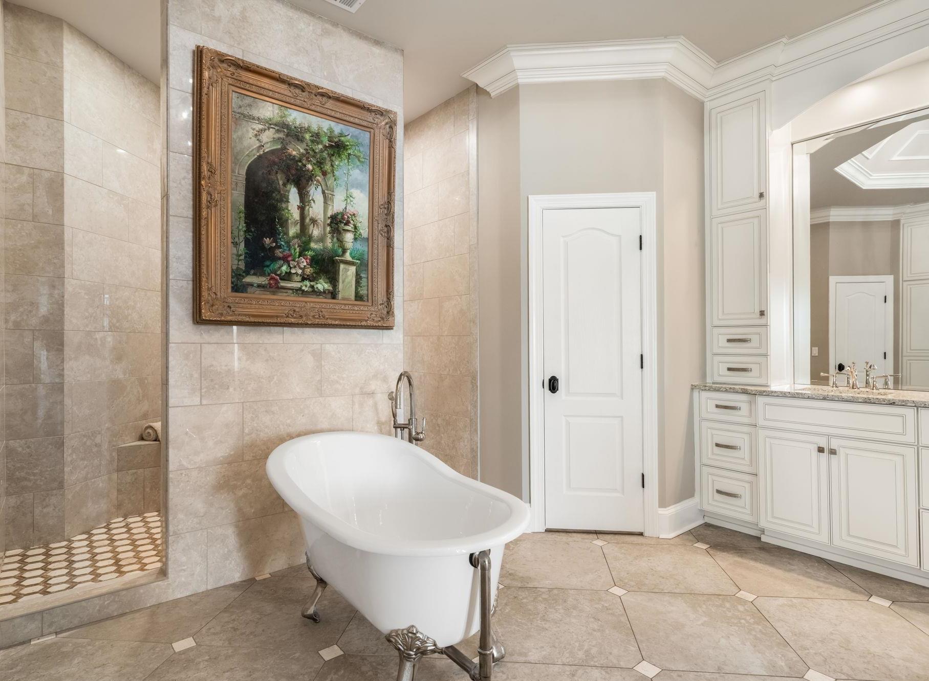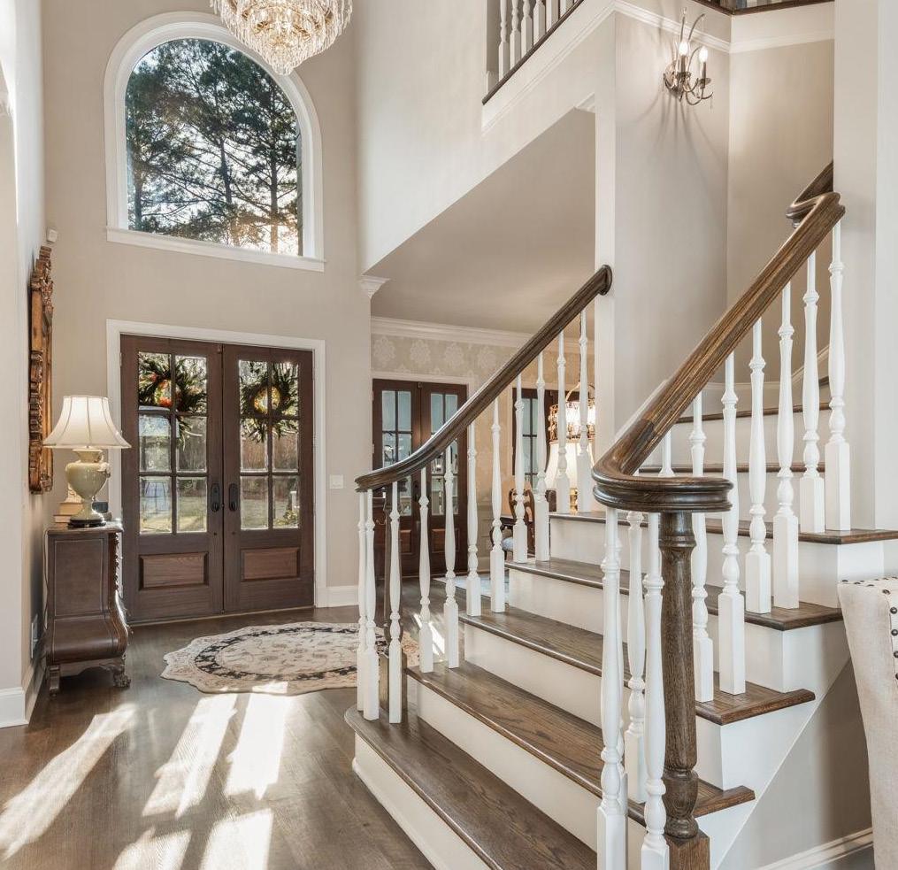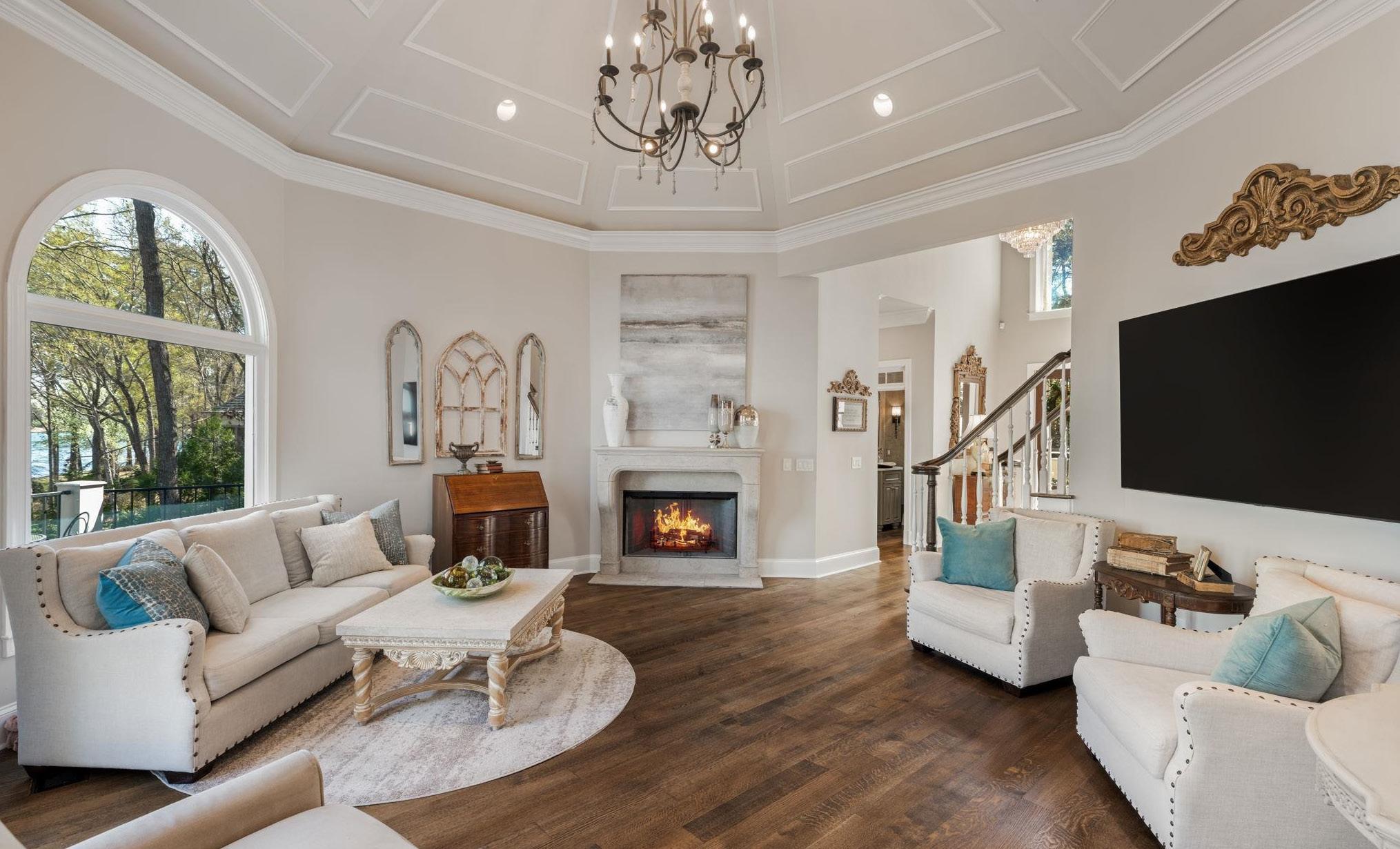 Situated on nearly an acre of private property, the estate is approached by a long, meandering driveway that creates a sense of arrival. Inside, timeless architectural details—including intricate trim, crown molding, detailed staircases, and finely crafted ceilings—frame sweeping views of the lake and golf course throughout the home.