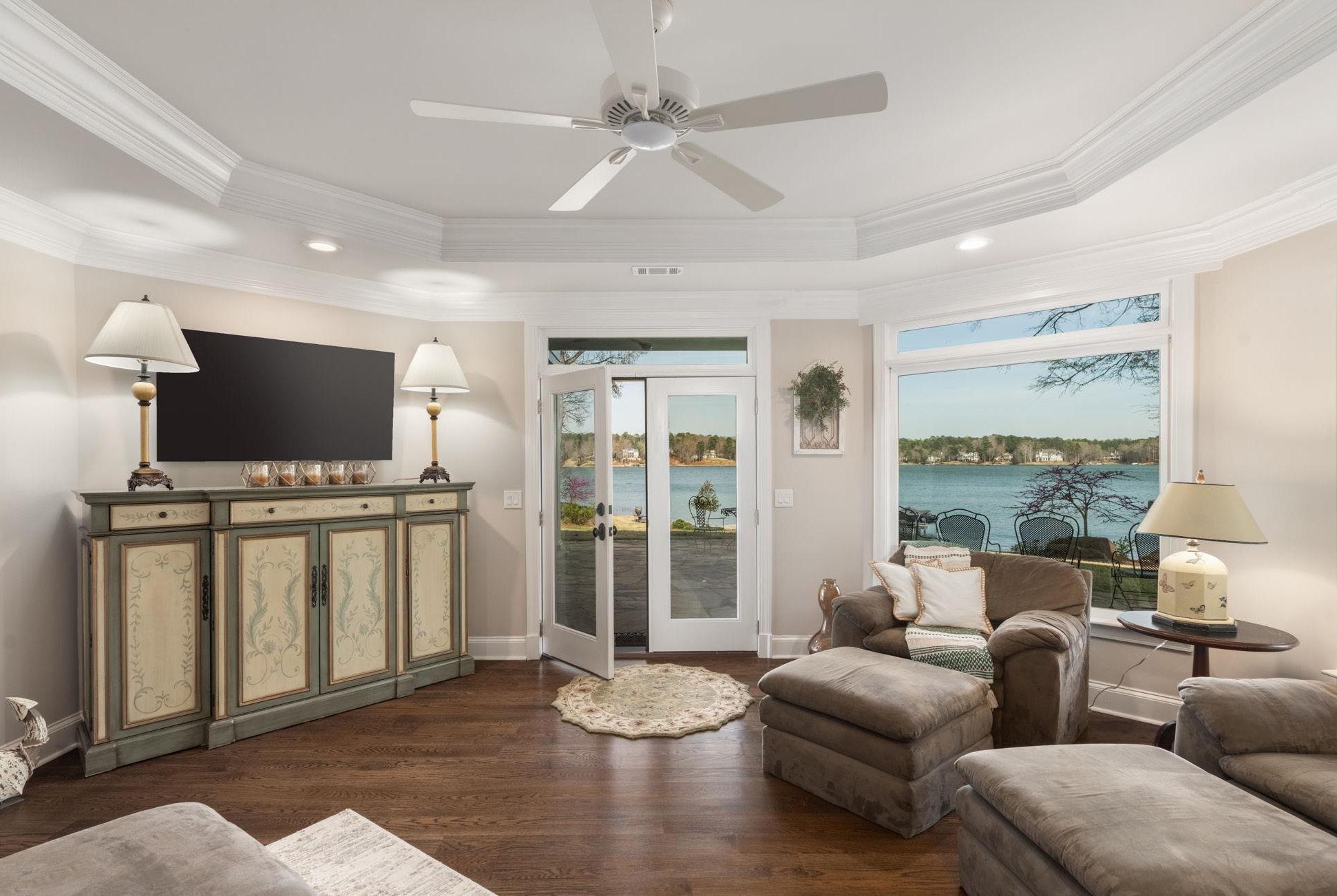 The terrace level expands the home’s versatility with a large family room, game room, secondary kitchen—ideal for extended stays or an in-law suite— and an additional guest suite, all enjoying front-row lake views.