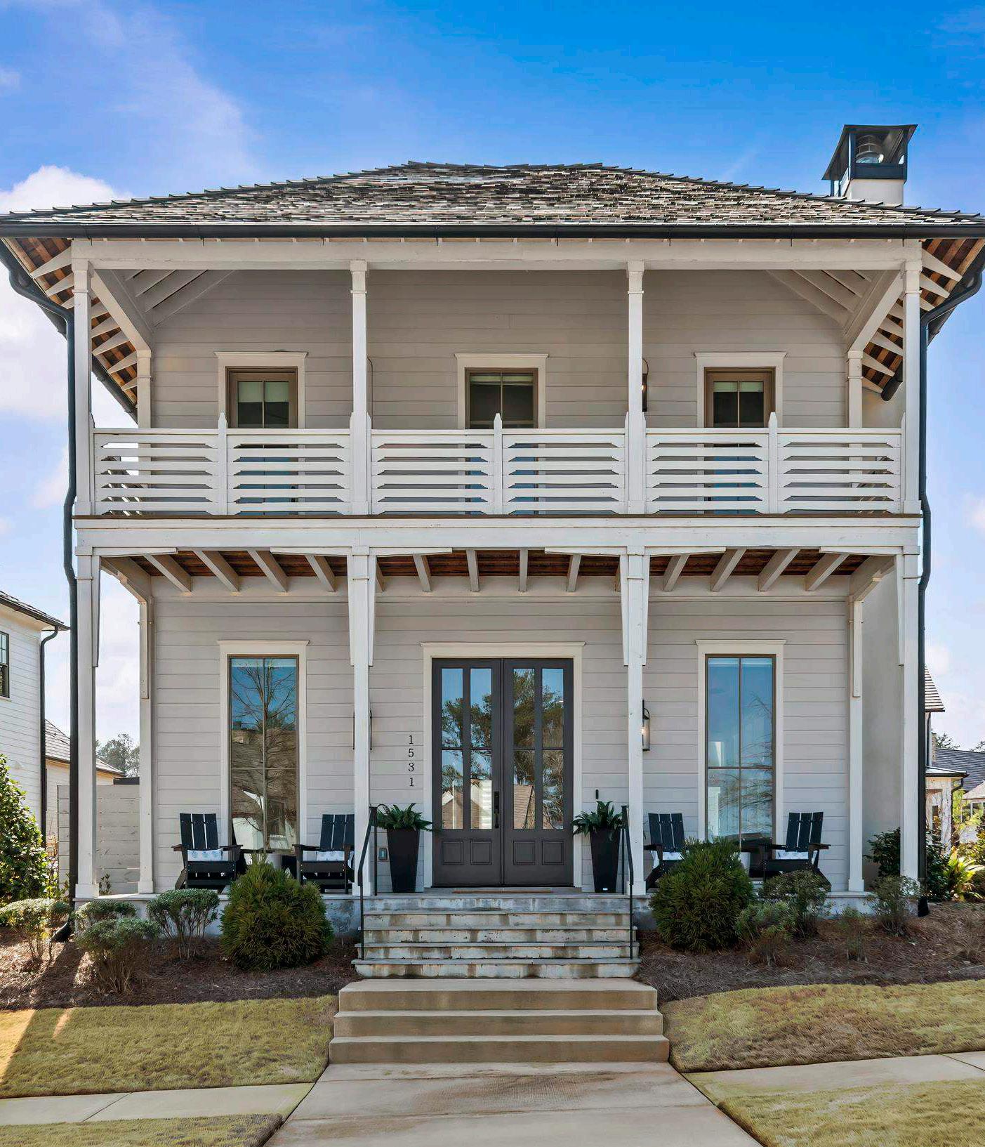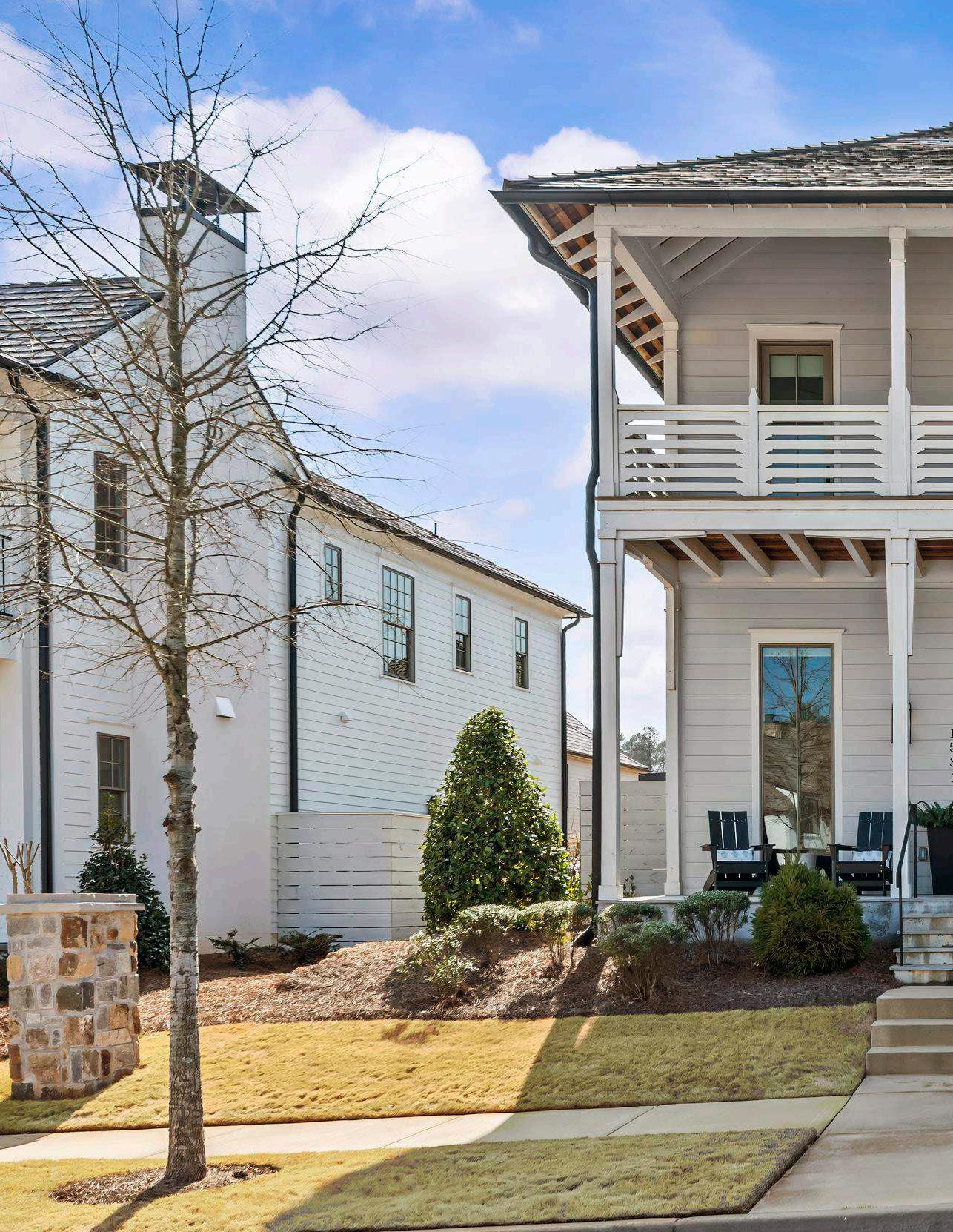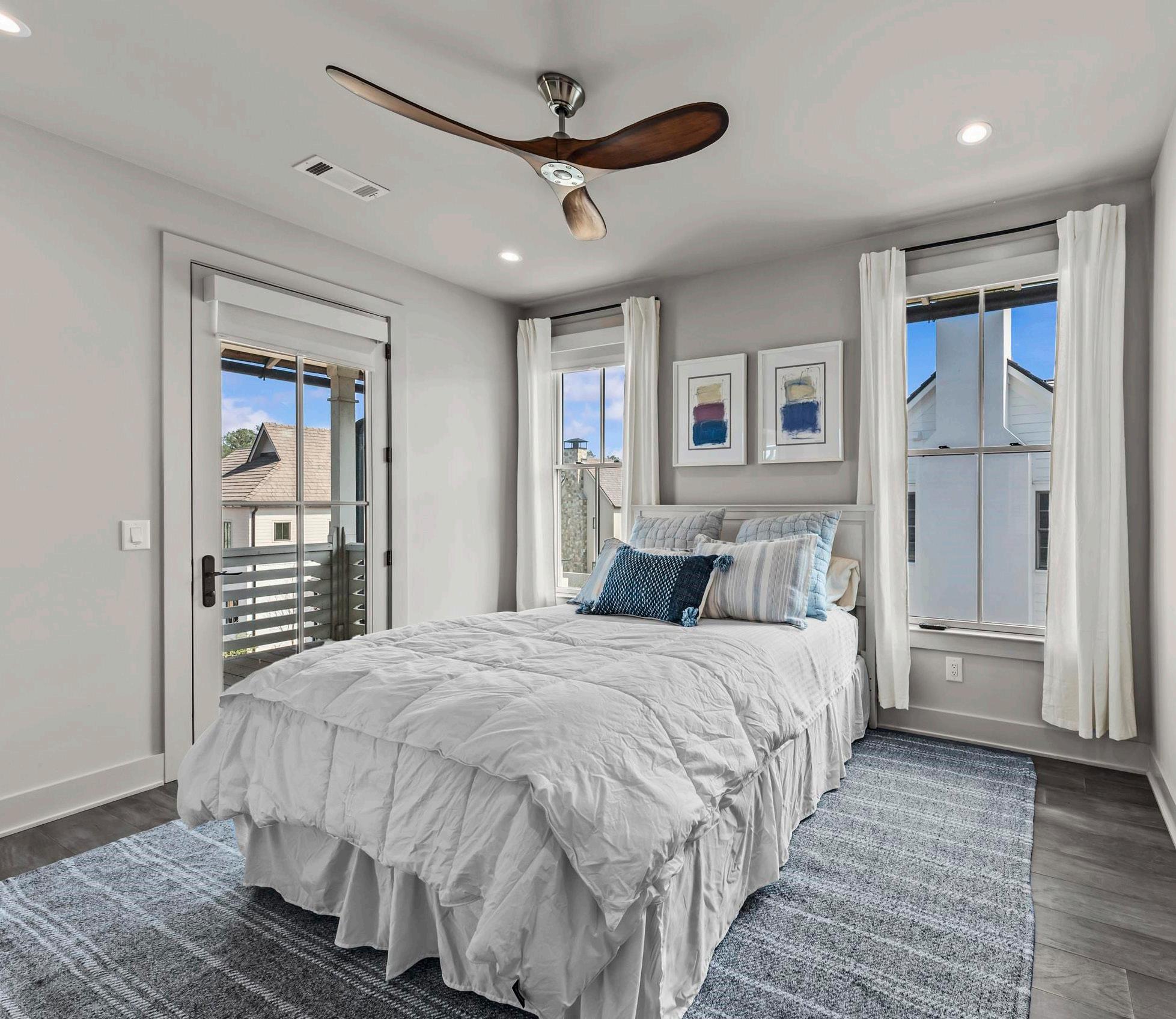 Upstairs, two guest suites each feature en suite baths, offering comfort and privacy for family and guests. Two additional bonus spaces provide opportunities for recreation, a media lounge, fitness, or a dedicated office. A powder bath serves this level for added convenience. An upper-level patio offers the ideal setting for al fresco dining while taking in lake and village views.