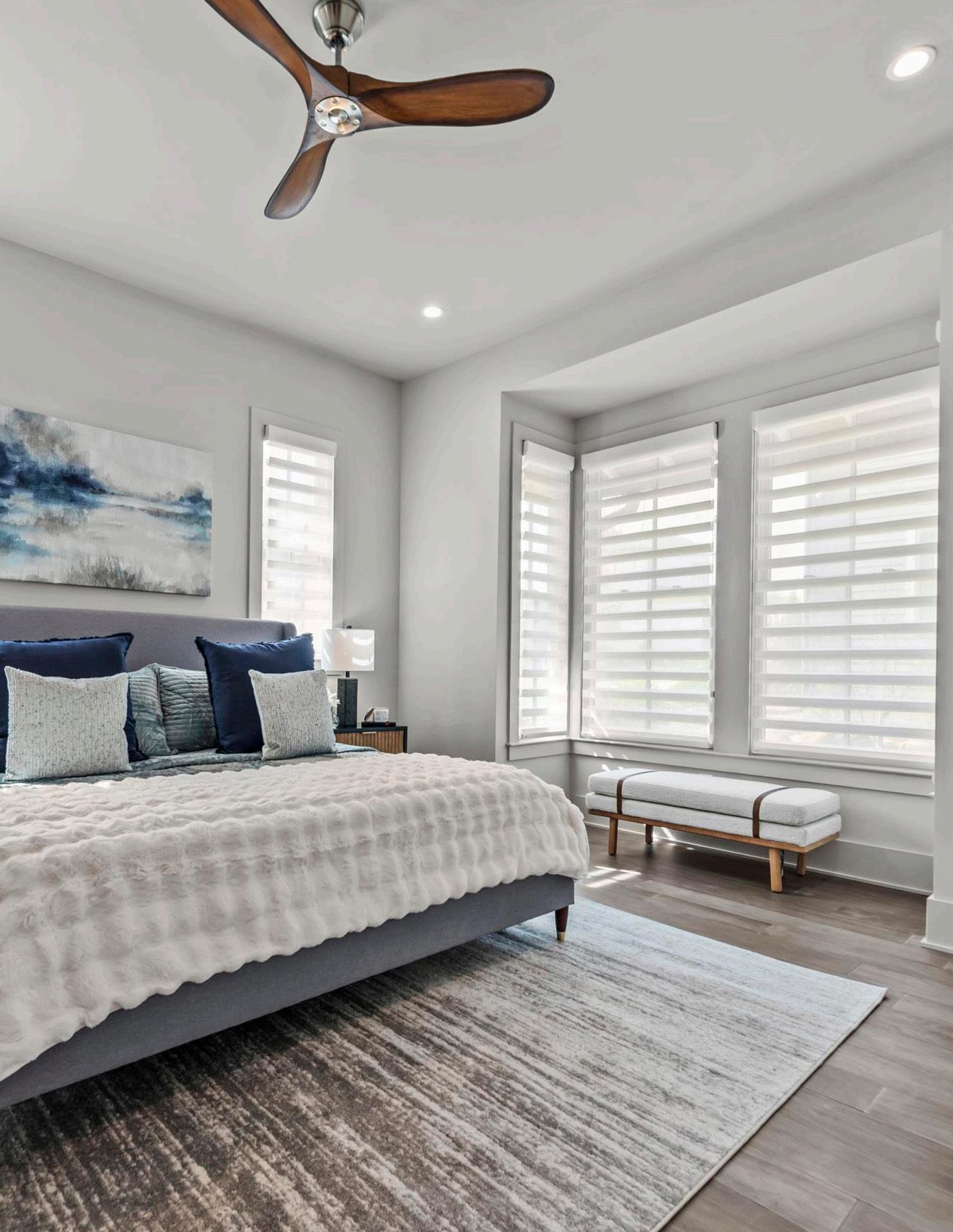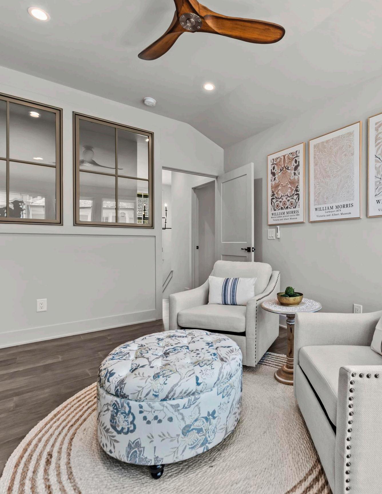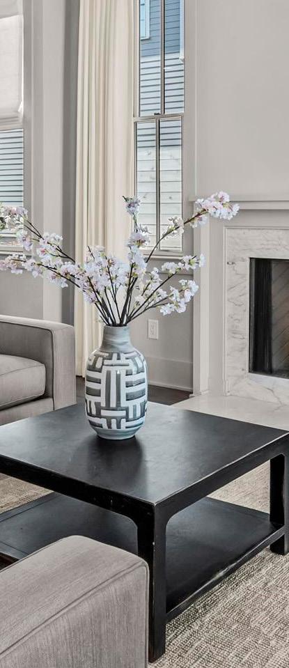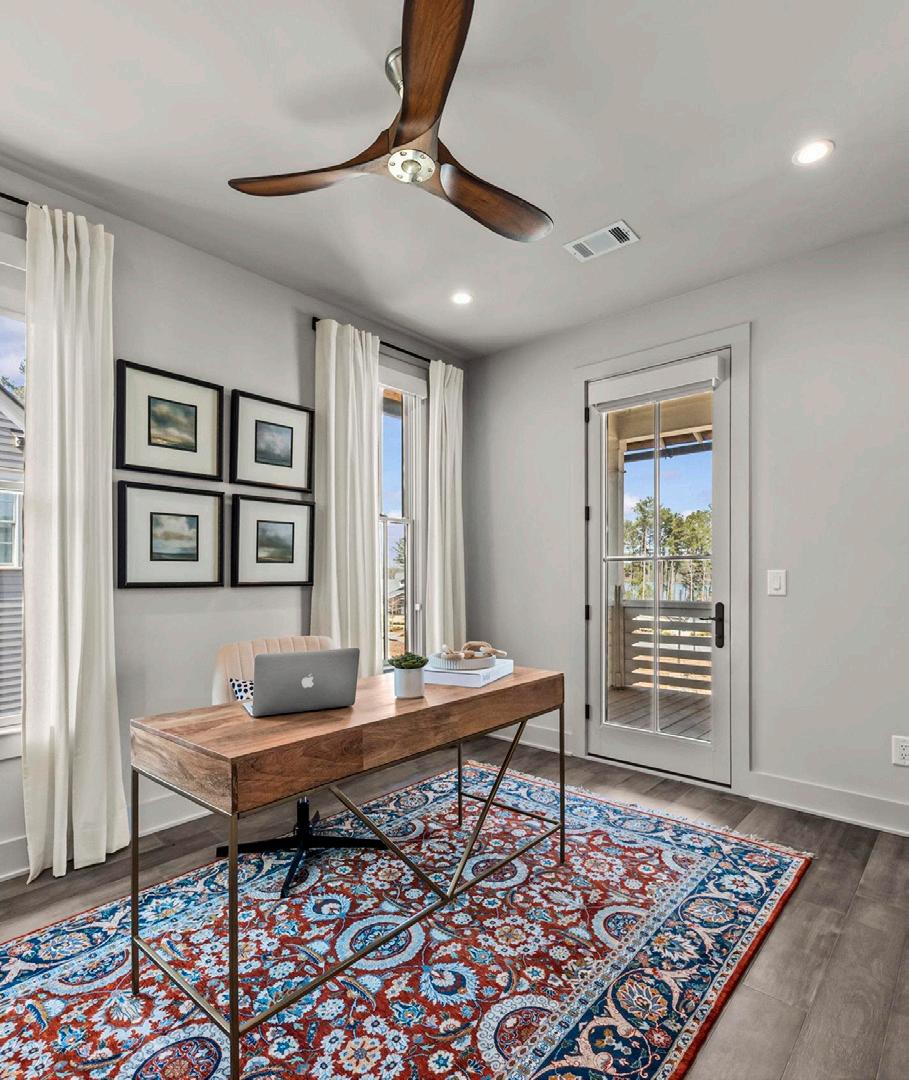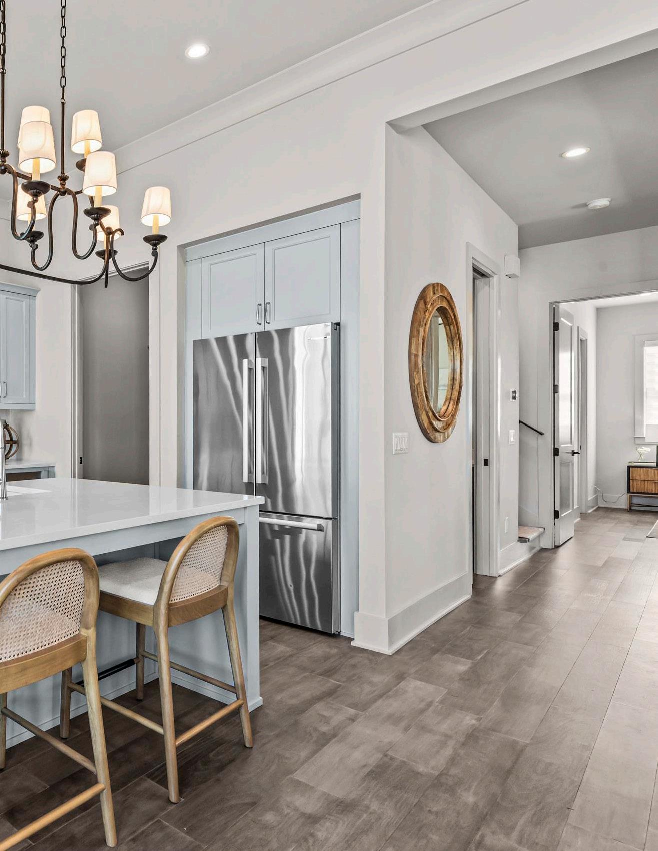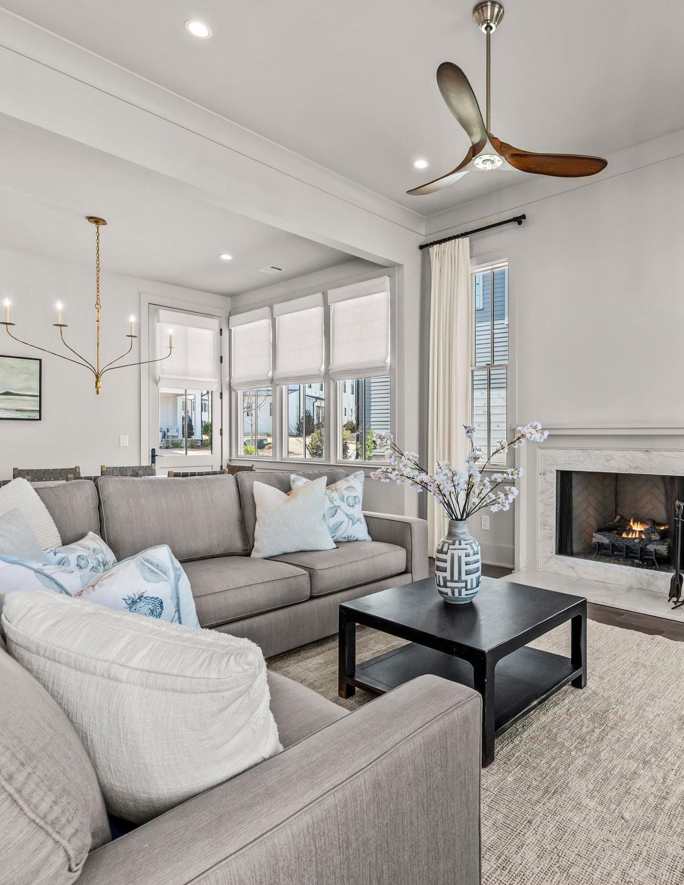 The great room is anchored by a fireplace and flows seamlessly into the kitchen and dining areas, creating a cohesive main living space tailored for everyday comfort and effortless entertaining. The gourmet kitchen is thoughtfully appointed with a substantial island offering bar seating, top-of-the-line appliances, abundant custom cabinetry, and a spacious walk-in pantry, combining clean, simplistic design with everyday functionality.